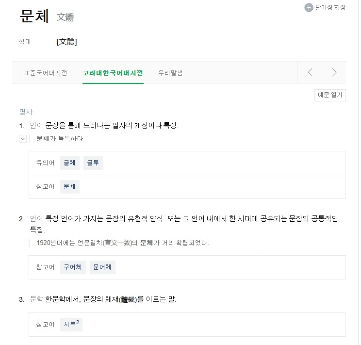 문체란 무엇일까. 아는 것 같은데 직유와 은유로 귀에 쏙 박히게 한 마디로 표현하긴 어렵다. 네이버 사전은 세 가지 출처를 보여준다. 나름 균형이며 방패다. 나는 고려대 한국어 대사전 정의 중 1번이 좋다. 문학적, 학문적 해석보다 글쓴이의 개성이나 특징이라는 사람 위주의 설명이 마음에 든다.