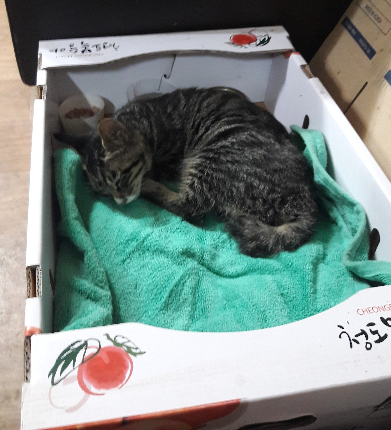 출근을 하면 밥을 채워주고, 똥을 치웠다. 다음은 투약. 고양이를 안아봤던 기억도 없는 내겐 참 낯선 일이었다. 장갑을 끼고 배운 대로 턱을 살짝 눌러 입을 벌리고 물약을 주사기로 조금씩 먹인다. 한 번으로 되지 않는다. 몇 번 반복한다. 다음은 안약. 눈을 아래위로 잡아서 크게 벌리고 안약을 두세 방울 넣고 엄지 손가락으로 감은 눈을 살살 눌러준다. 시간이 꽤 걸린다. 그래도 조금씩 익숙해진다. 토요일부터 삼사일 동안은 내처 잠만 잔다. 죽었나 싶어서 손가락으로 살짝 찔러보거나 쓰다듬으면 반응은 해서 살아있구나 하고 안심을 했다.