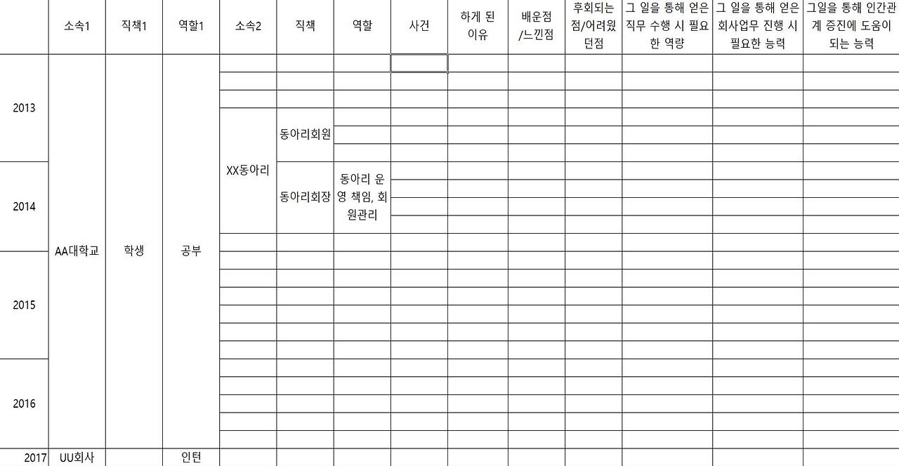 다양한 방법으로 경험을 정리해 볼 수 있겠지만 쉽게 접근하기 위해 내가 소속되었던 곳을 생각해 보자. 언제부터 언제까지 어떤 단체에 소속이 되어있었는지를 소속되었던 기간과 함께 기록한다.