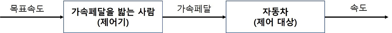 자동차의 예로 다시 설명한다면 자동차는 제어대상이고 자동차의 속도는 제어대상의 출력이 된다. 가속 페달은 제어대상인 자동차의 입력이 되며, 가속페달을 밟는 사람이 의도를 가진 누군가, 즉 제어기가 된다.