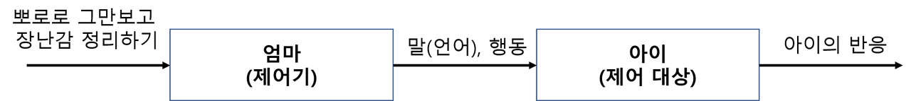 엄마가 아이에게 하는 말 또는 행동이 제어대상의 입력인 동시에 제어기의 출력이 되고 이 모든 것들의 시작인 목표(목표 또한 엄마로부터 나온다)는 아이가 뽀로로 동영상을 그만 보고 장난감을 정리하는 것이다.
