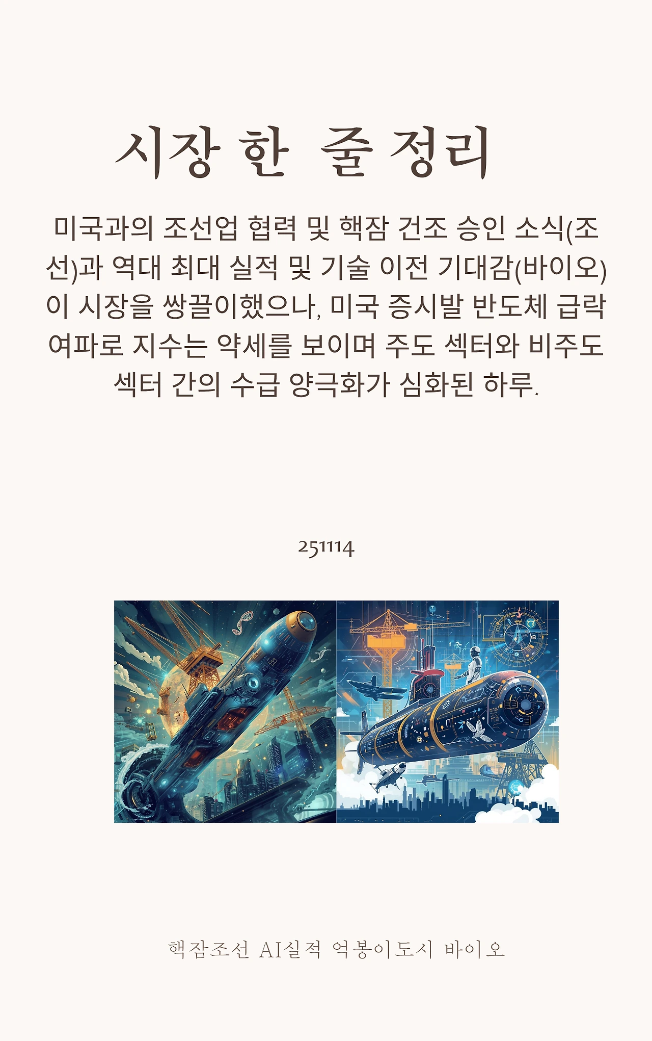 오늘의 시장은 '선택과 집중'의 중요성을 극명하게 보여주었습니다. 시장 전체가 공포에 질려 있을 때, '정책/국가적 아젠다(조선)'와 '명확한 실적/기술 우위(BIO/의료AI)'라는 두 가지 확실한 모멘텀을 가진 곳으로 유동성이 피난하는 모습을 확인했습니다.
