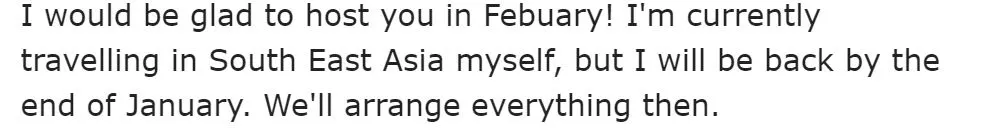 "너를 우리 집에 호스트 할 수 있을 것 같아. 네 비행 정보를 미리 보내주면 내가 픽업 가도록 할게."