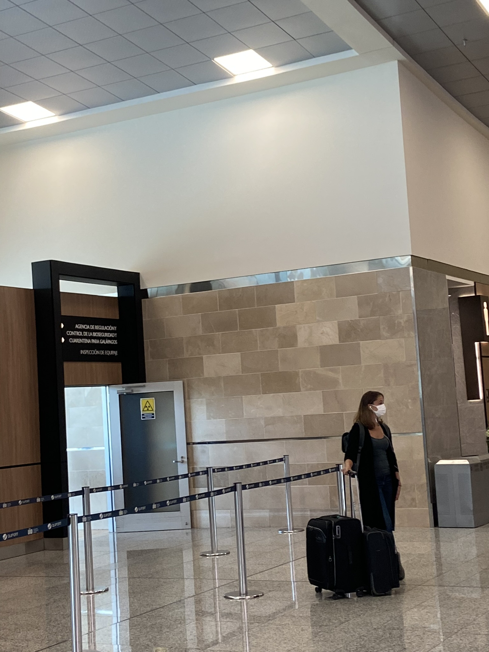 그 다음 검색대에 가방과 소지품을 컨베이어 벨트로 보내 갈라파고스에 소지 금지 품목이 있는지 확인 받는다. 청정 지역 갈라파고스로 가져갈 수 없는 것들이 있다. 과일이나 채소, 씨앗, 식물, 조개 같은 것으로 만든 기념품 등.