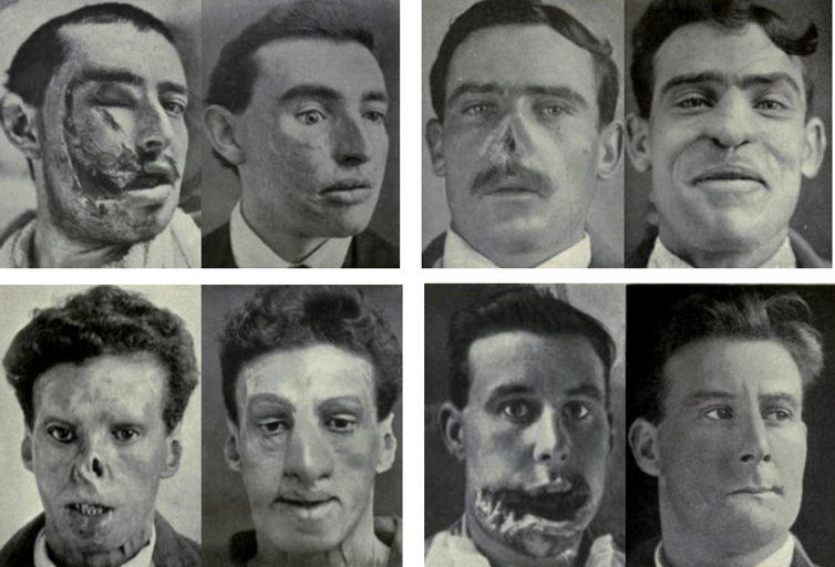 본래 성형외과학이라는 학문이 본격적으로 태동하고 발전한 계기는 세계 1차 대전이 결정적이었다. 그 이전까지의 전쟁과 달리 1차 대전의 전투에서는 자동소총이나 다이너마이트 등의 중화기가 본격적으로 이용되었고, 또한 양 측의 진영이 땅을 길게 파놓은 뒤 치르는 '참호 전투'의 양상이 벌어졌는데, 이로 인해 병사들이 이전과는 달리 참호 바깥으로 얼굴을 빼꼼히 내놓다가 보니 안면부 손상, 그것도 중상을 입는 경우가 비약적으로 늘어나게 된 것이다. 전방에서 안면부의 심한 외상이나 화상을 입은 부상병들은 제대로 된 처치를 받지 못한 채로 후방 병원으로 이송되었으며, 이들이 운이 좋아 생존하게 된 경우 그들의 안면부 손상은 딱히 치료가 되지 않은 상태로 흉하게 아물었을 것이다. 이러한 부상병들이 넘쳐나게 되면서 이전까지는 없었던 방법으로 안면부의 조직 결손을 치료해야 하는 도전 과제가 생겼고, 이러한 도전을 앞서 구술한 국소, 유리 피판 및 이식의 방법을 통해 극복한 성형외과학의 선구자들이 등장하게 되었다.
