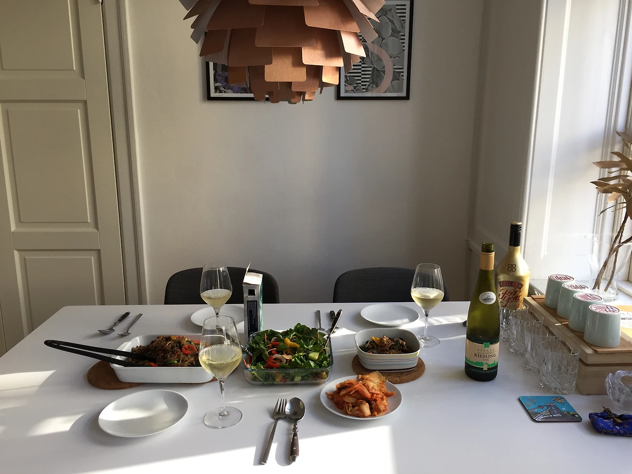 5점 만점에 5점을 기대했지만 코펜하겐 한식점에도 5점 만점에 3.5점을 준 알렉스에게 주관식 평점을 받는 것으로 끝이 났다. 이사벨과 나는 브리스톨에서 브리스톨 명물인 서스펜션 브릿지와 열기구가 새겨진 컵받침과 초콜릿 맛이 나는 술인 Baileys, 브리스톨 초콜릿 맛집에서 산 쿠키와 초콜릿을 선물로 사 왔다. 잡채와 샐러드, 화이트 와인을 한 잔씩 하고 나니 달콤한 것이 땡겼다.