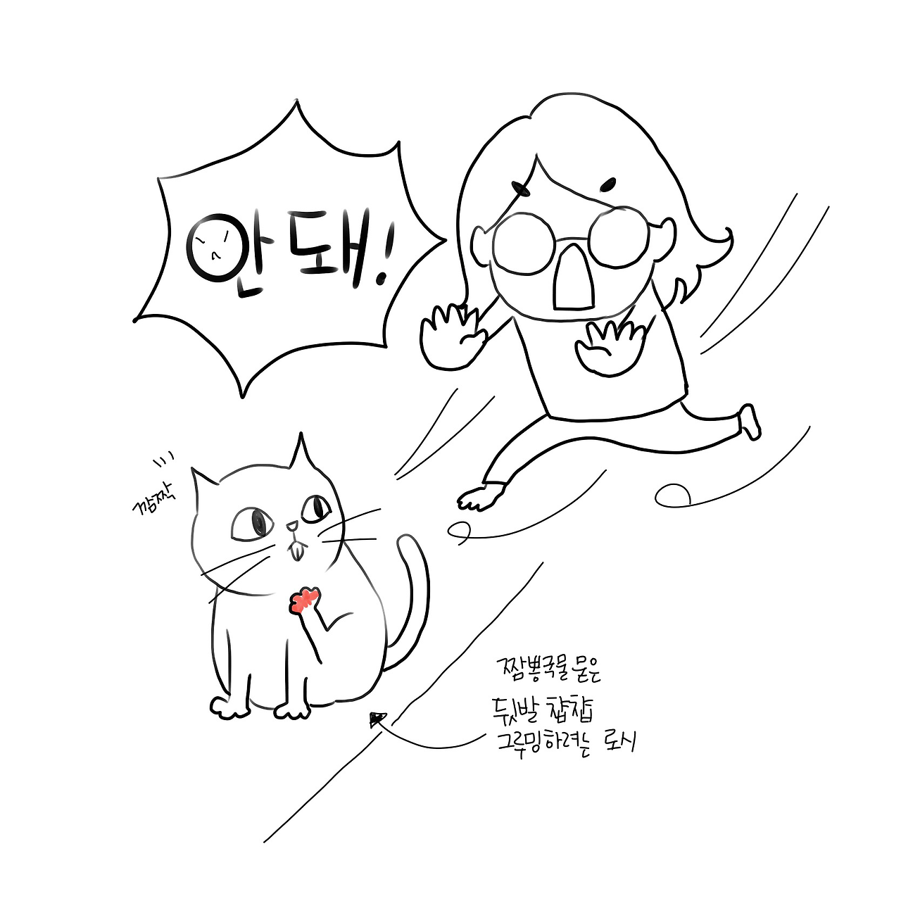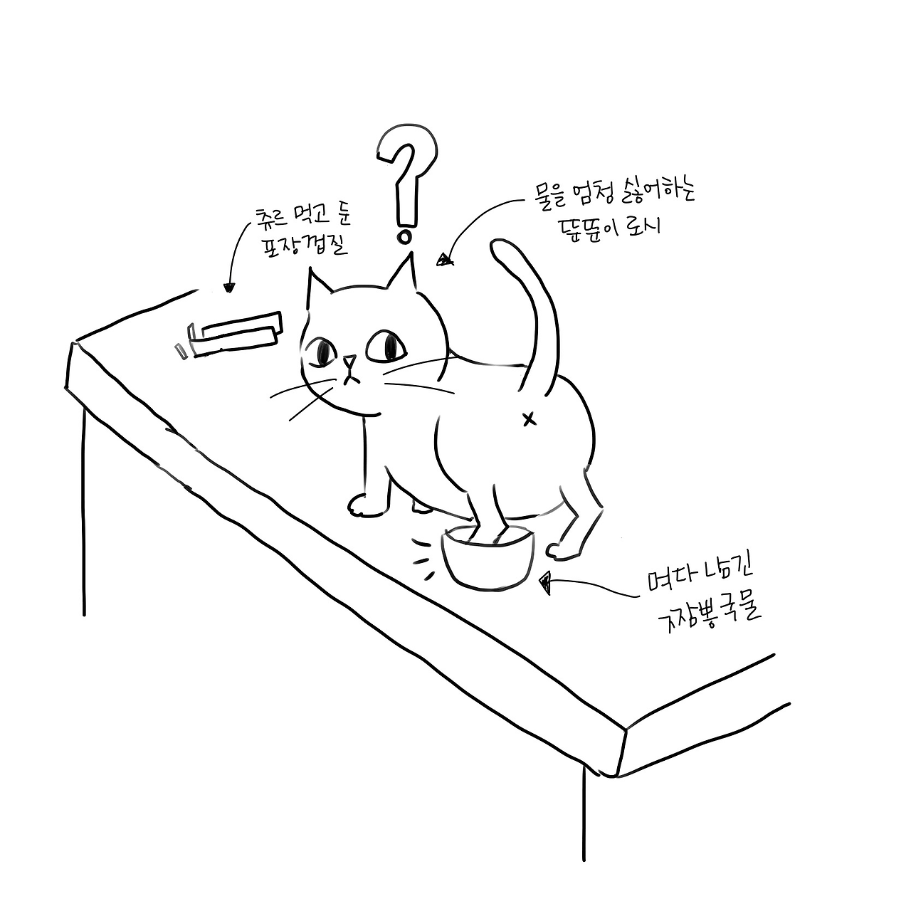 싱크대 구석에 둔 빈 츄르 봉지를 찾으로 원정나온 로시. 집사 둘이 먹다 남은 짬뽕 국물 그릇에 발은 빠뜨리고(?) 말았다.