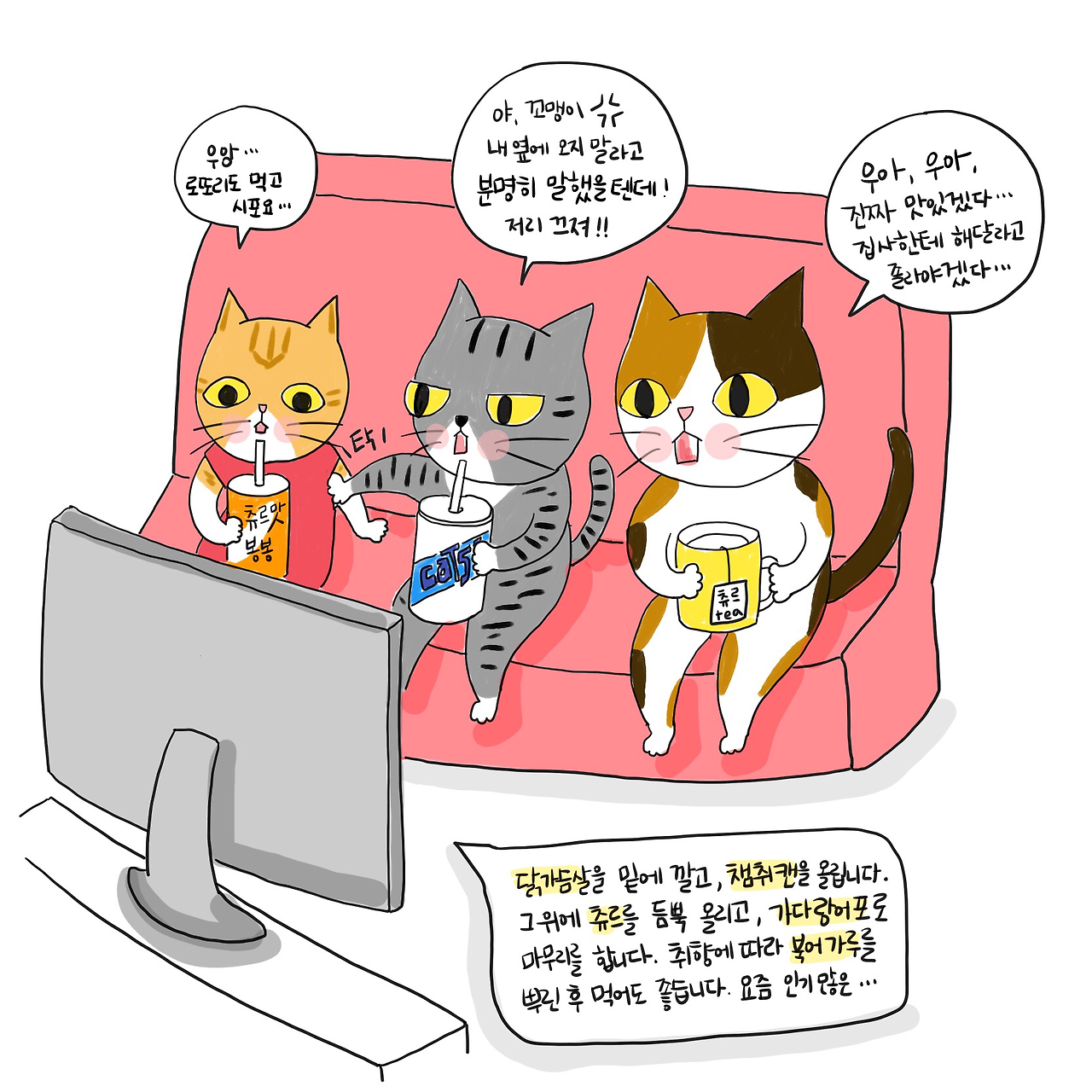 각자 좋아하는 음료를 들고 나란히 앉아 냥이티비를 본다.