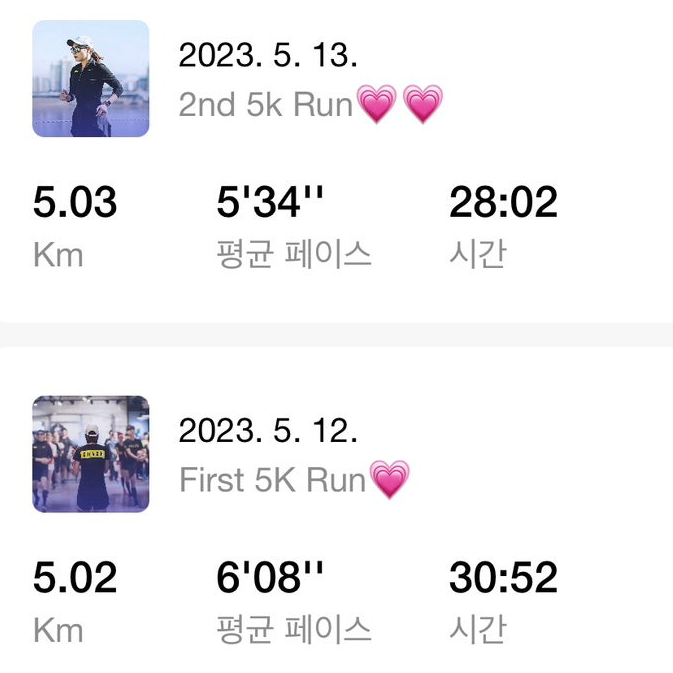 2023년 5월 12일, 태어나 처음으로 쉬지 않고 5km를 달린 날에는 몹시 기뻐 하트 하나를 붙였다. 놀랍게도 그다음 날 바로 기록을 경신해서 하트를 두 개 붙였다.