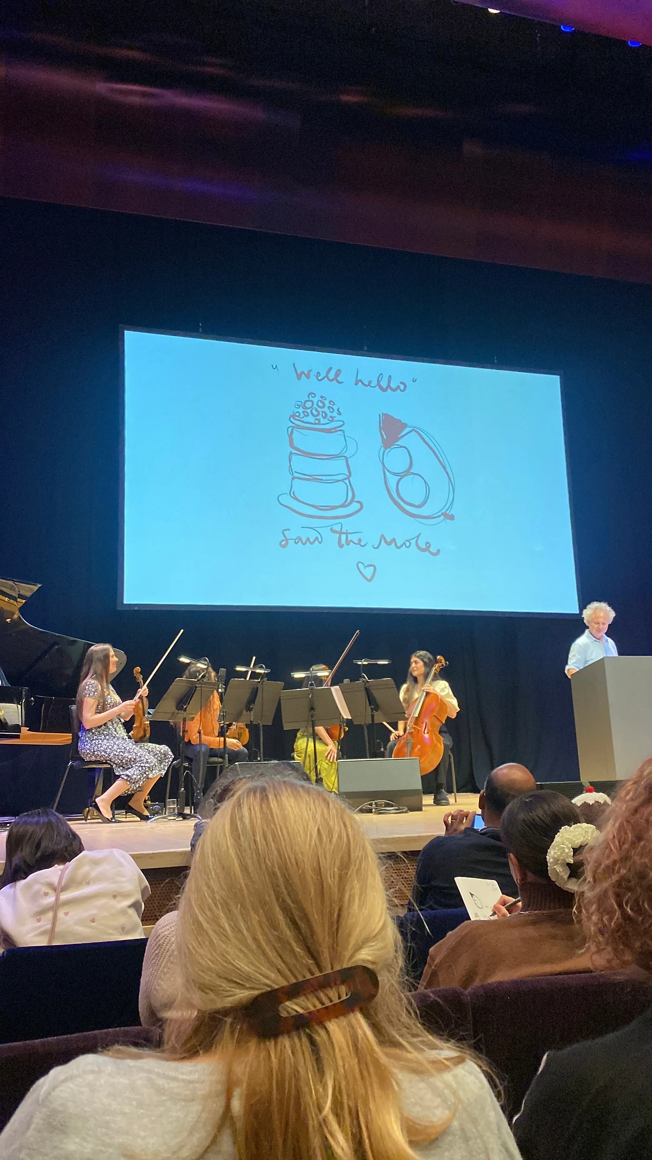 그의 첫 책 ‘소년과 두더지와 여우와 말‘은 코로나 팬데믹이 낳은 걸작이다. 가까운 친구를 잃은 상실감을 그림과 위로의 말로 표현해 인스타 그램에 올린 것이 팬데믹동안 큰 관심을 받아 책으로 만들어진 것이다. 게다가 탄탄한 그의 팬층에는 음악을 하는 이소벨이라는 사람이 있어서 그의 그림과 이야기의 배경이 되는 음악을 만들었다. 그리고 오늘 바비칸 센터에서 글과 그림과 음악, 그리고 이야기가 함께하는 환상의 공연이 완성된 것이었다.