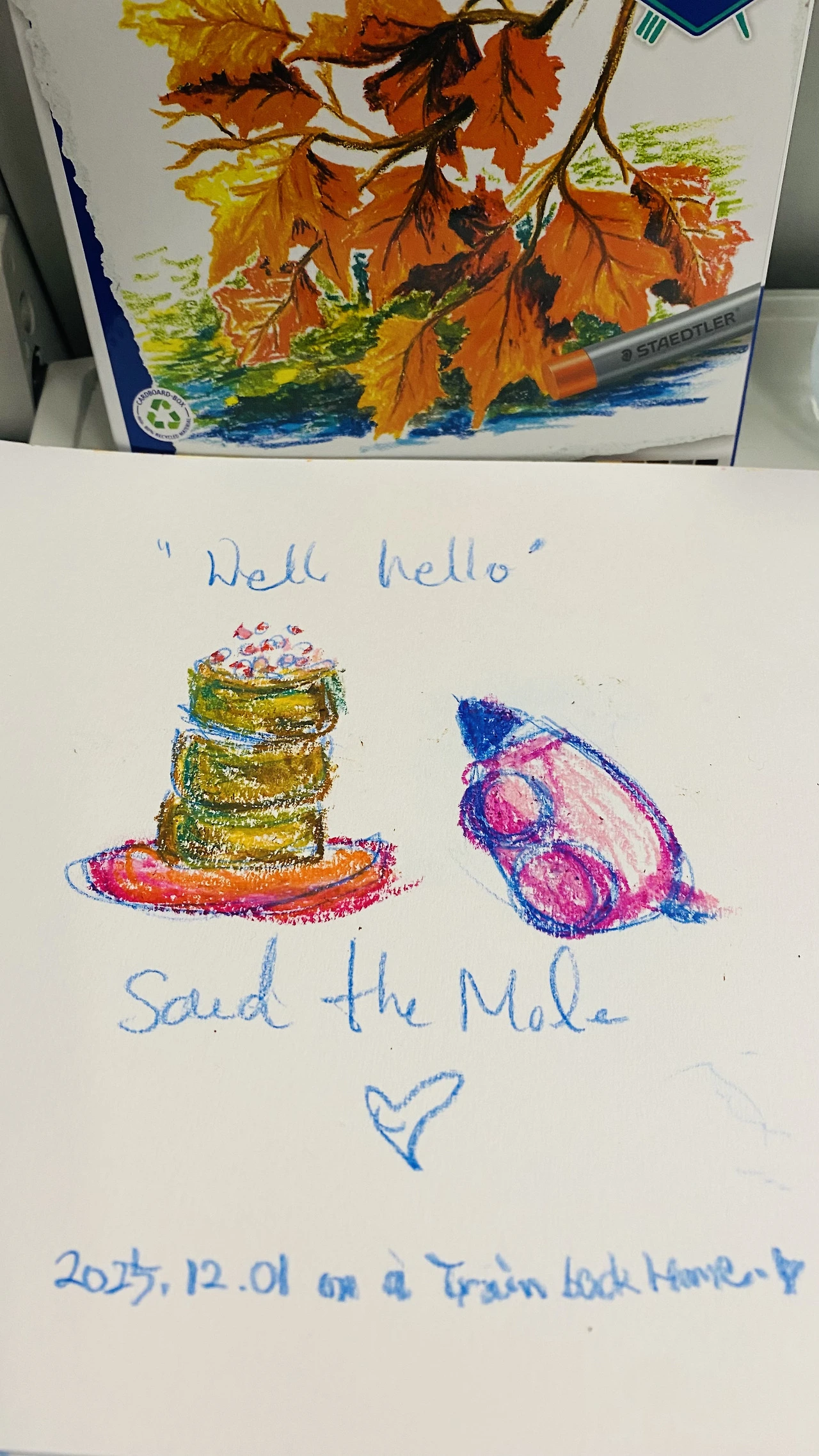 그의 그림과 메시지를 사랑하는 사람들에게 그를 직접 마나 함께 그림을 그릴 수 있는 이 자리는 매우 설레는 것이었다. 나도 스케치북을 챙기고 공연장 가는 길에 오일파스텔을 사면서 정말 기분이 좋았다. 현장에서 그가 가르쳐준 장면은 매우 간단했지만 한편으론 간단한 선과 도형이 형상이 되고 이야기의 주인공이 되는 것을 직접 보는 것이 너무 신기했다.
