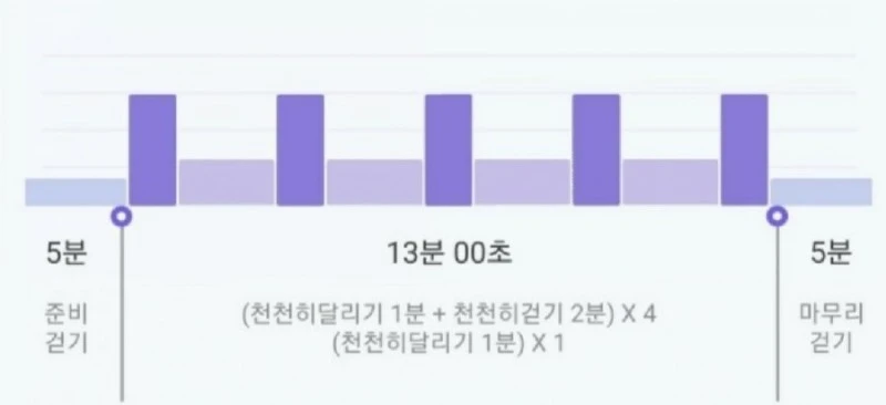 경쾌한 트레이너의 목소리에 따라 웜업으로 5분간 준비 걷기부터 했다. 허리를 펴고, 가슴을 내밀고, 턱을 당기고 바른 자세로 팔을 앞뒤로 흔들며 힘차게 걸었다. 그 후 천천히 달리기 1분, 천천히 걷기 2분을 다섯 번 반복했다. 천천히 1분을 달리고, 2분을 쉬는 패턴이라 그리 힘들지 않았다. 지면을 박차고 달리는 기분이 자못 상쾌하고 좋았다. 그래도 마지막 1분 달리기는 꽤 숨이 차고 심장의 쿵쾅거림이 느껴졌다.