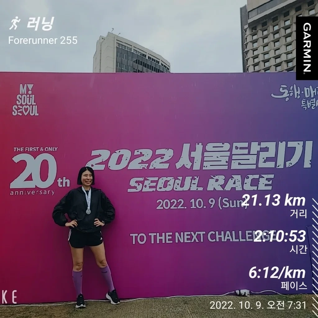그래서 이번 10월에 열린 서울레이스에서도 혼신의 힘을 다했다. 그동안 훈련한 결과로 또 한 번 레벨업을 하고 싶었다. 마라톤을 축제처럼 즐기고 싶고, 응원도 받고 싶어서 블로그에 나의 하프 완주 예상 시간 이벤트를 열었다. 지난 2시간 14분 기록이 무척 잘 달린 결과라고 본문에 썼지만, 다수의 사람들은 그 이상으로 내가 잘 달릴 거라 예상했다. 글을 쓰기 전엔 지난번보다 딱 1분만 당기고 싶은 마음이었지만, 사람들의 기대에 부응하고 싶어 2시간 9분을 목표로 달리고 또 달렸다. 최종 결과는 2시간 10분 53초! 나에게 의미 있는 기록을 또 한 번 세울 수 있었다.