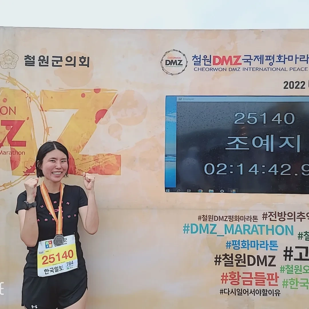 세 번째로 참가한 철원 DMZ 국제평화마라톤 하프 코스에서 기대보다 훨씬 좋은 기록인 2시간 14분 42초로 완주했다. 페이스 6분 50초 정도로 달려 2시간 30분 정도로 완주할 계획이었는데, 평소의 꾸준한 달리기와 BK러닝 클래스를 통해 배운 달리기 자세와 훈련 덕분에 기대 이상의 좋은 기록을 세웠다. 많이 얼떨떨했지만 시간이 지날수록 성장한 내가 너무 기특했다. 잘 달렸다는 사람들의 축하도 좋았다. 풀 마라톤을 완주하고 싶다는 가슴속 타오름이 커져갔고 '가능'이라는 단어를 손에 쥔 느낌이었다.