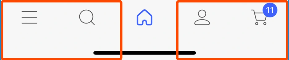 왼쪽은 카테고리, 검색 버튼 즉 상품을 탐색하는 행위를 위한 버튼이 위치하고 있다. 오른쪽에는 마이페이지, 장바구니 즉 결제, 배송과 관련된 행위를 위한 버튼이 위치하고 있다.