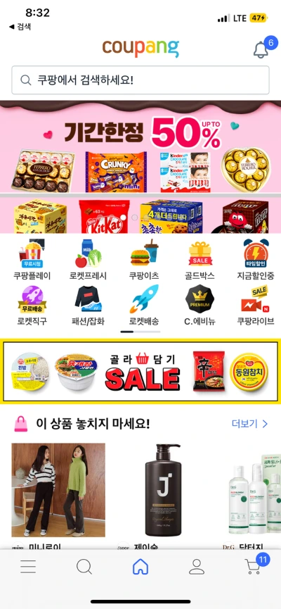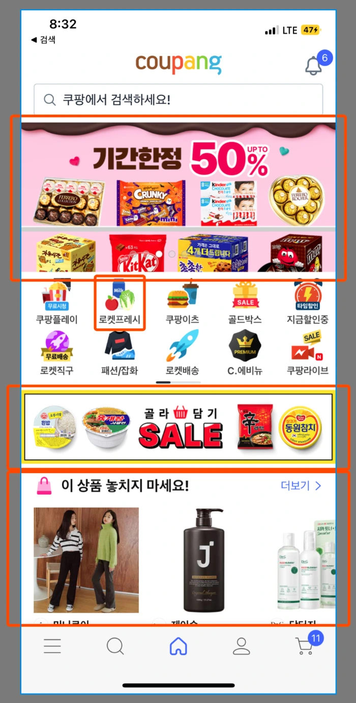 상단 레이아웃에 SALE 중인 배너, 중간 레이아웃의 로켓 프레시, 하단 레이아웃의 <이 상품 놓치지 마세요!>가 눈에 띈다. 그중 중간 레이아웃에서 로켓 프레시가 눈에 띄었고 마침 햇반이 다 떨어진 게 생각나 로켓 프레시를 누른다.
