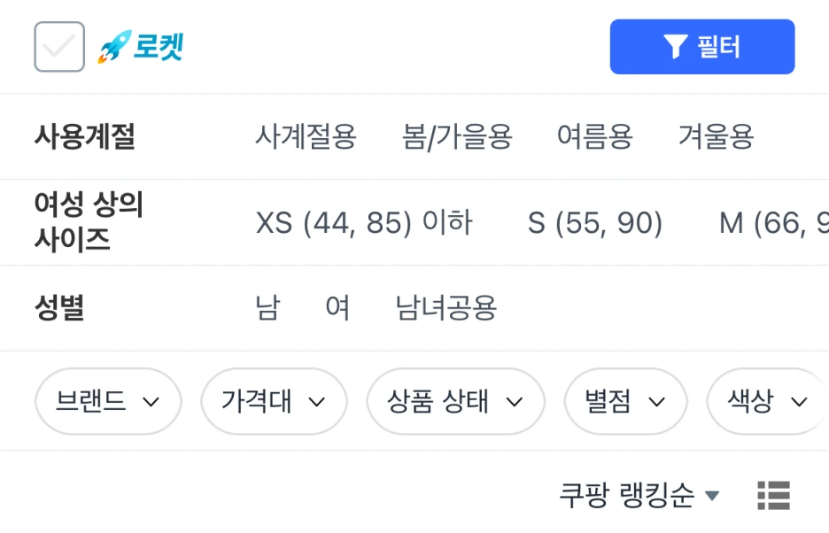 쿠팡은 상단 레이아웃에 옷을 고르기 전 다양한 사용자에 맞는 옵션을 제공함으로써 자기가 원하는 옷 단 한 가지를 구매한다는 목적을 이루게 하기 위해 우리를 도와주고 있다.