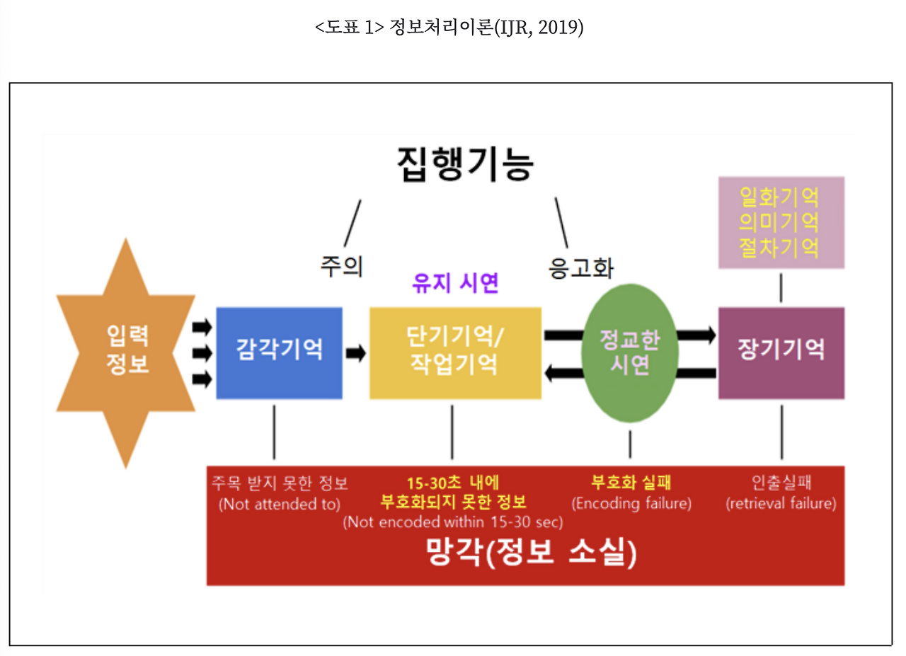 만약 국어수업에서 '별 헤는 밤'의 주제를 필기하다가 '시적화자'와 '시적상황'에 대한정보를 들었음에도(자극) 감각기억에서 <주의> 받지 못했다면 단기기억(작업기억)으로 이동되지 못해 망각, 즉 정보가 소실될 것이다.