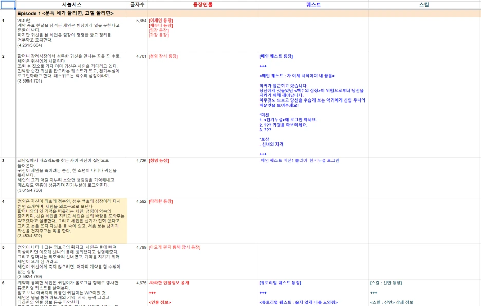 매 편마다 편당 시놉시스, 등장인물, 퀘스트, 스킬, 신물, 주요 설정 요렇게 6가지로 나눠서 정리를 하고 있어요.