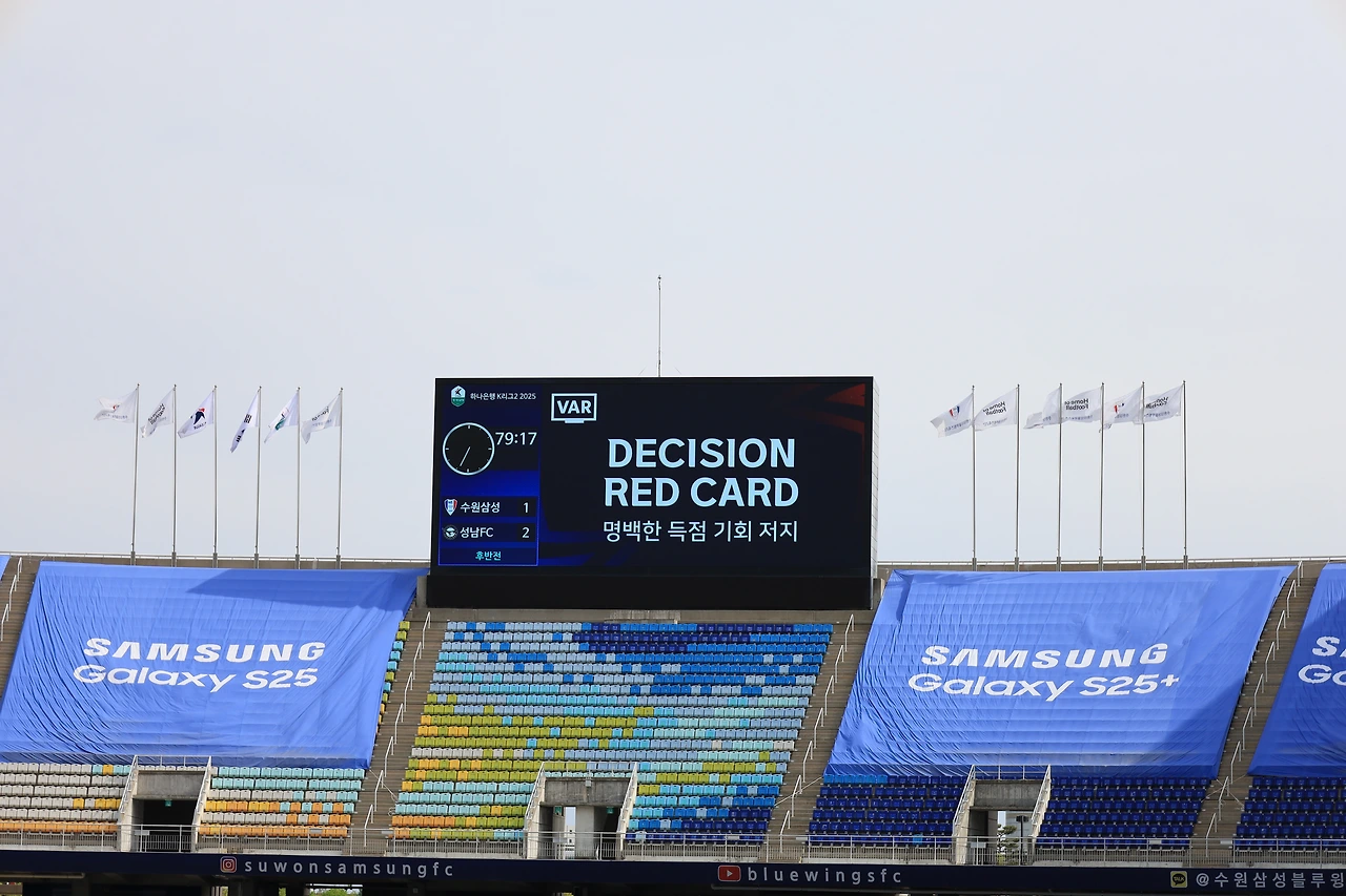 부상자들을 수습한 이후 심판이 갑자기 VAR을 보러 갔다. Red Card에 대한 판독이었다. 성남 선수들이 많이 다친 상황이었기에 수원 선수에 관한 판독이라 생각했다. 그러나 판독을 마친 심판의 손은 골문을 찍었다. 수원의 PK 찬스가 주어졌다. 권완규의 유니폼을 잡아당긴 성남 베니시오는 레드카드를 받고 즉각 퇴장됐다.