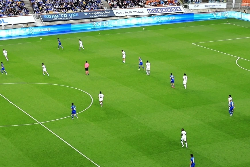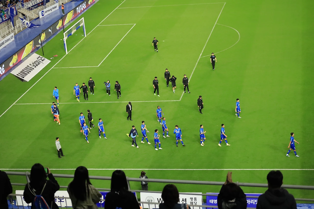 김포와 수원은 순위 차이가 큰 편이어서 수월하게 승리할 거란 생각을 가지고 킥오프를 지켜봤다. 스포츠란 그날의 컨디션과 운세가 결정한다는 사실을 잠시 간과했던 것 같다. 경기를 시작하자마자 김포의 슈팅이 골대를 맞혔다. 긴장감이 확 찾아오는 순간이었다. 김포는 기본 5백 수비 진영으로 수원의 공격을 차단했다. 틈을 뚫고 들어가기가 쉽지 않은 수비 구조였다.