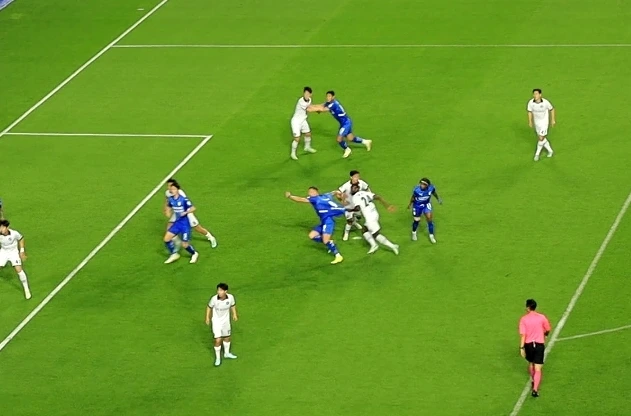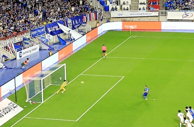 그리고 얼마 지나지 않은 시간, 이날의 가장 핫한 순간이 연출되었다. 수원의 코너킥 찬스에서 기회를 만들지는 못했지만 일류첸코가 두 손을 들면서 억울함을 호소하는 제스처를 취했다. 이미 양 팀 선수들이 수원 골대 앞까지 이동한 상황인데도 일류첸코는 심판을 찾아가 무언가를 이야기했다. 그리고 심판은 VAR을 보러 뛰어갔다. 김포 수비수가 일류첸코의 유니폼을 잡아당겨 PK가 선언되었다. 경기장은 다시 함성으로 달아올랐다.