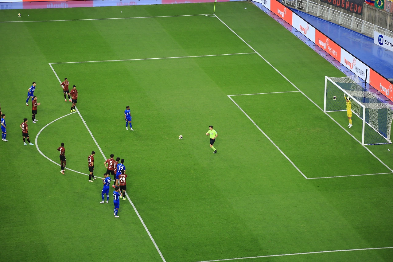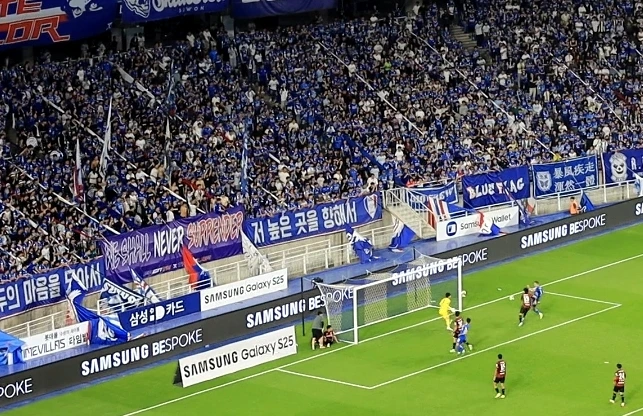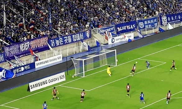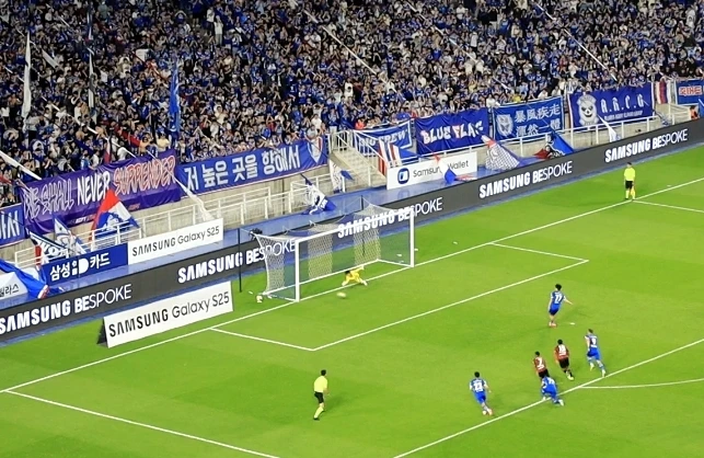 뒤이은 수원의 공격에서 심판의 손이 페널티킥을 선언했다. 부천 수비수의 핸드볼 반칙이 있었다. 앞서 말했듯이 기뻐하는 수원팬들의 마음속 한편에는 불안이 도사리고 있었다. 과연 성공시킬 수 있을 것인가. 키커는 김지현이다. 숨죽인 팬들은 역전을 환호할 준비를 하는 동시에 실패할 수 있다는 평정심도 붙잡고 있다. 김지현이 움직인다. 공이 떠난다. 키퍼의 방향과도 일치한다. 골망이 철렁인다. 키퍼의 움직임보다 공의 속도가 빨랐다. 역전이다!