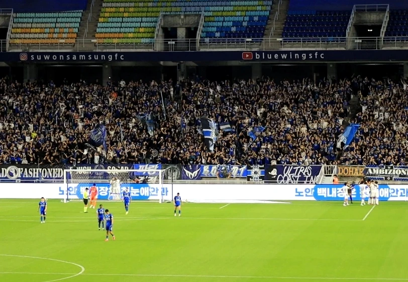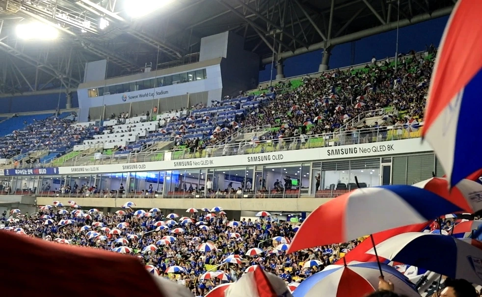 후반전이 시작되자 수원 관중들의 우산 퍼포먼스가 펼쳐졌다. E석과 W석의 1,2층에서 돌아가는 청백적 우산의 풍경은 장관이었다. 그러나 그 응원가가 끝나기도 전에 원정석이 다시 열광의 몸짓들로 들썩였다. 두 번째 실점이었다. 이러면, 이길 수 없을 것 같다는 예감이...