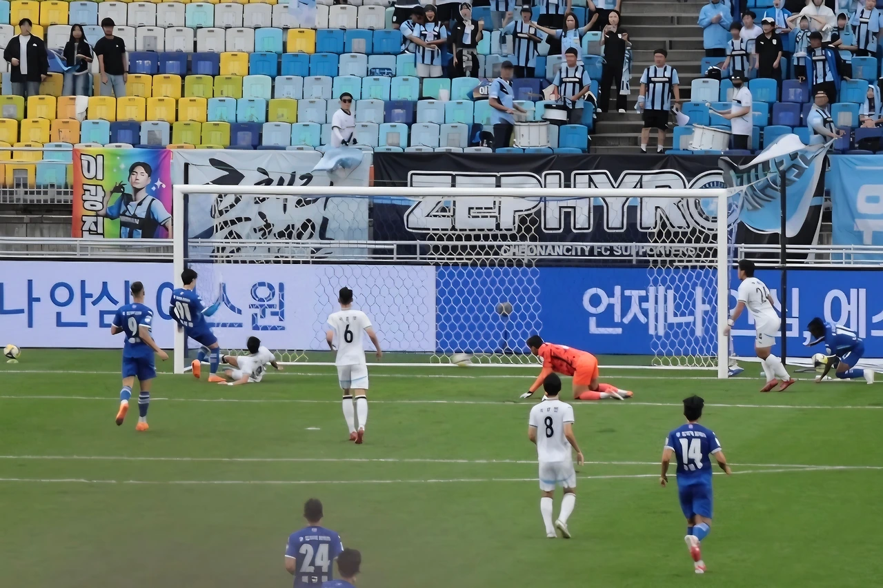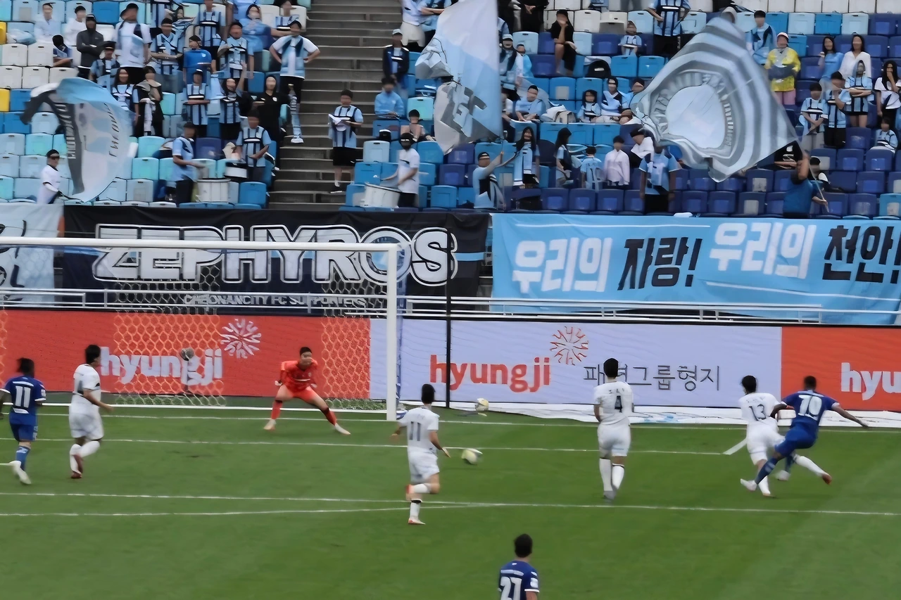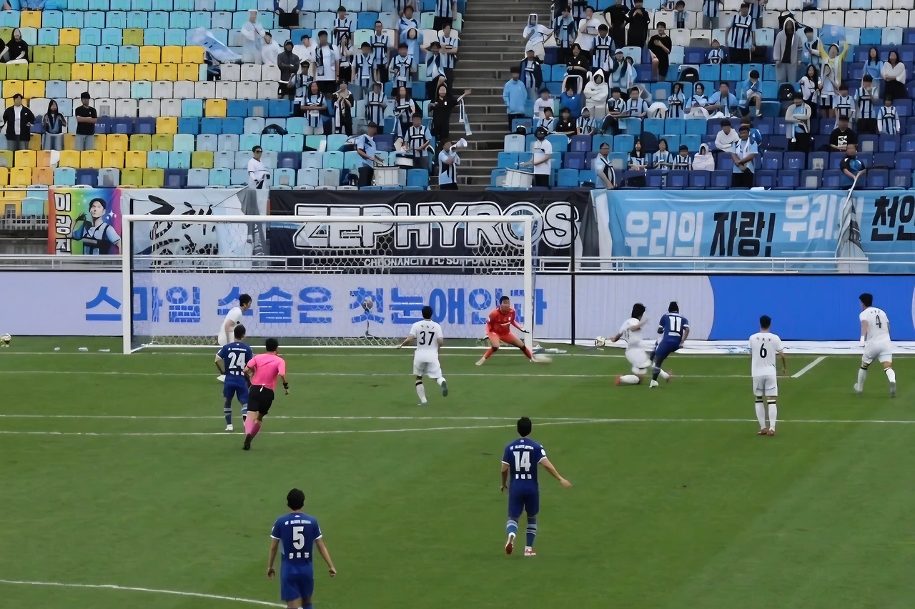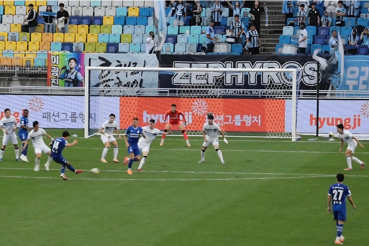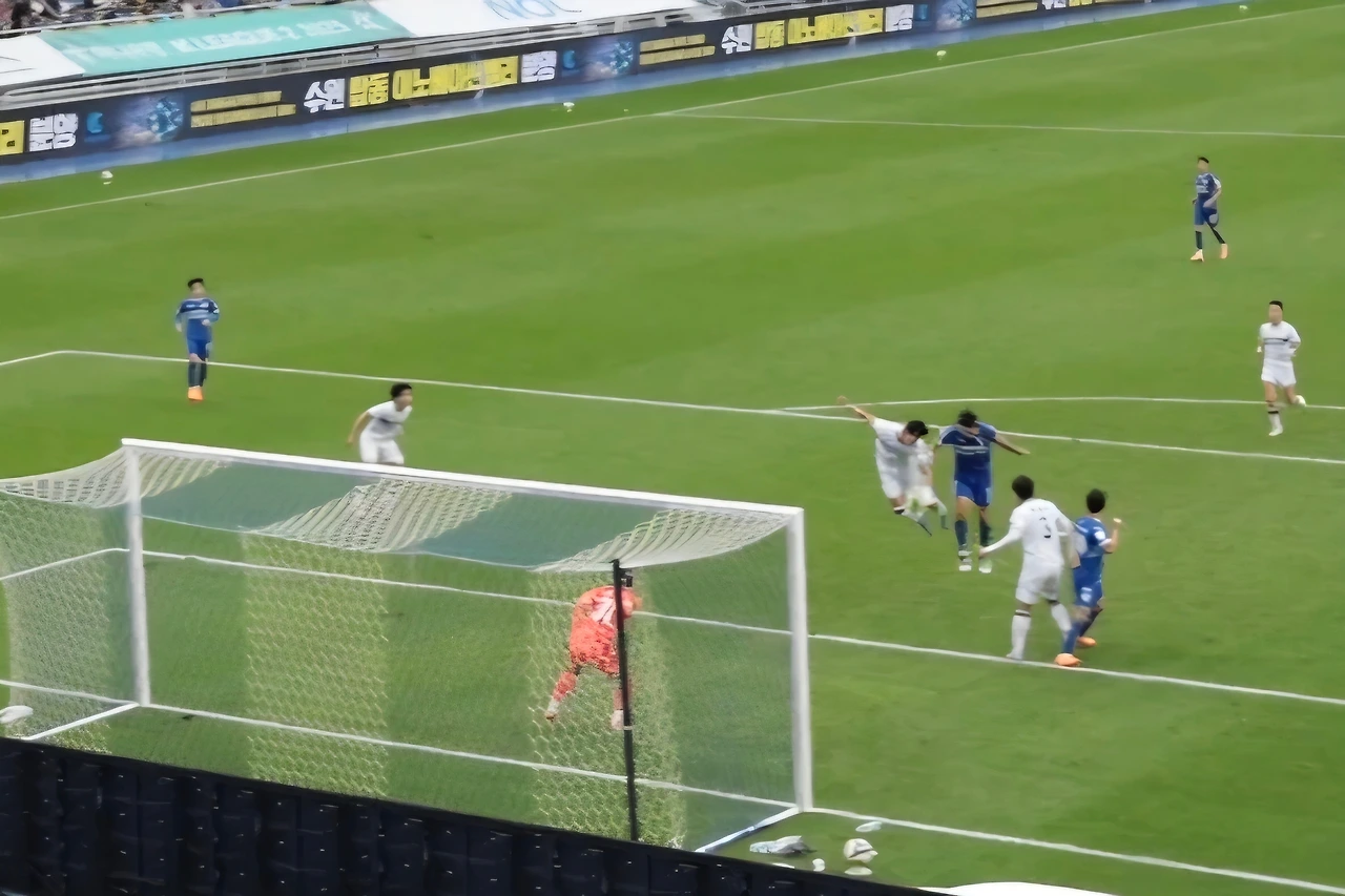 그래서 기대하지 않았던 상황인데 뒤쪽에 있던 바로 그 수원의 홍원진은 내 예상에 반박하는 모습을 보여주었다. 실로 충격적인 아름다움이었다. 붕 뜨기는커녕 낮고 빠르게 아래로 깔려서 골문을 향했다. 골의 방향도 키퍼의 손이 닿을 수 없는 골문 구석이었다. 홍원진의 침착성이 놀라운 골이었다. 너무 잘 차서 본인도 좀 놀라지 않았을까 추측해 본다. 어쨌든 드디어 선제골이 터졌다!