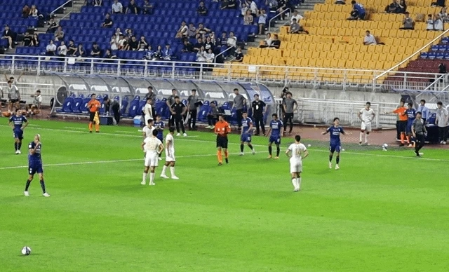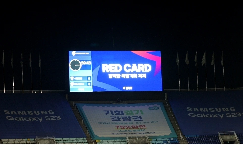 앗, 그런데 심판이 VAR을 보러 간다. 뭔가 접촉이 있었던 게 분명하다. VAR을 보고 심판이 경기장으로 복귀하는데 천천히 걷는다. 판정 번복이 아니면 보통 가볍게 뛰어 오면서 팔을 수평으로 가르며 별 거 아니었다는 표시를 하는데 천천히 걸으며 포항의 한 선수에게 다가간다. 퇴장이다.