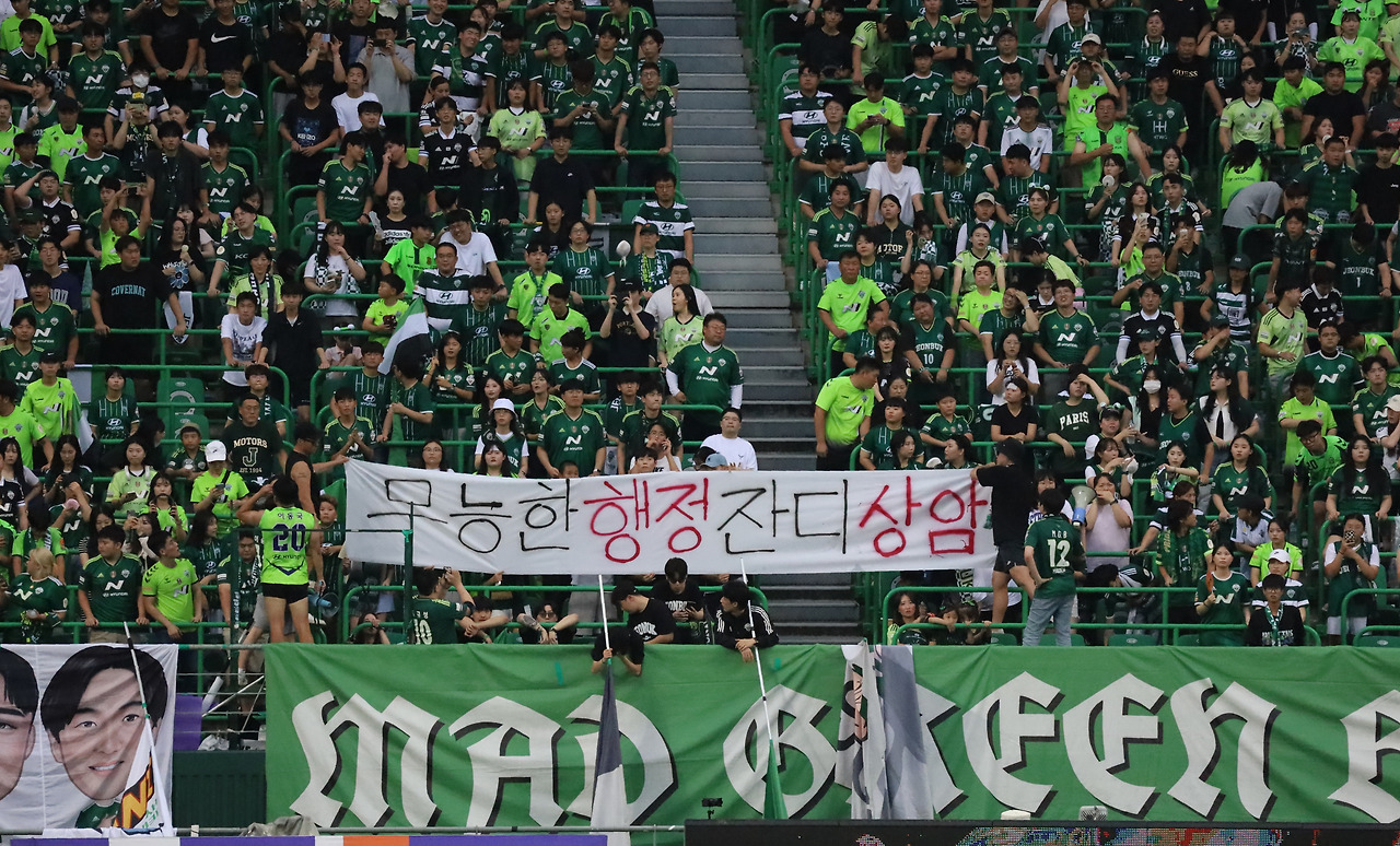 자신이 잘 모르거나 흥미가 없는 분야에 대해서는 그것에 관하여 깊게 생각해 보는 일이 쉽지 않다는 걸 안다. 또한 그럼에도 불구하고 자신이 관심 없는 분야를 인생의 중대한 부분으로 삼으며 살아가는 사람들의 취향과 철학을 존중해 주어야 한다는 생각도 그리 어려운 일은 아니다. 그런데 정부가 그걸 짓밟았다. 뭐 축구 몇 게임 나중에 하면 되지,라는 마인드로 축구의 당사자, 관계자, 팬들이 오래전부터 꾸려왔던 계획을 무참히 짓밟았다. 정신만 훼손시킨 게 아니라 실제로 상암 구장의 잔디는 심각할 정도로 짓눌러졌다. 전북의 홈팬들은 원정팀에 대한 조롱 대신 정부를 향한 비판의 메시지를 걸개에 담았다. 축구팬으로서 고마운 저항이라 할 수 있겠다.