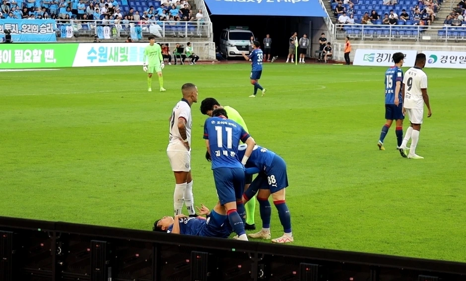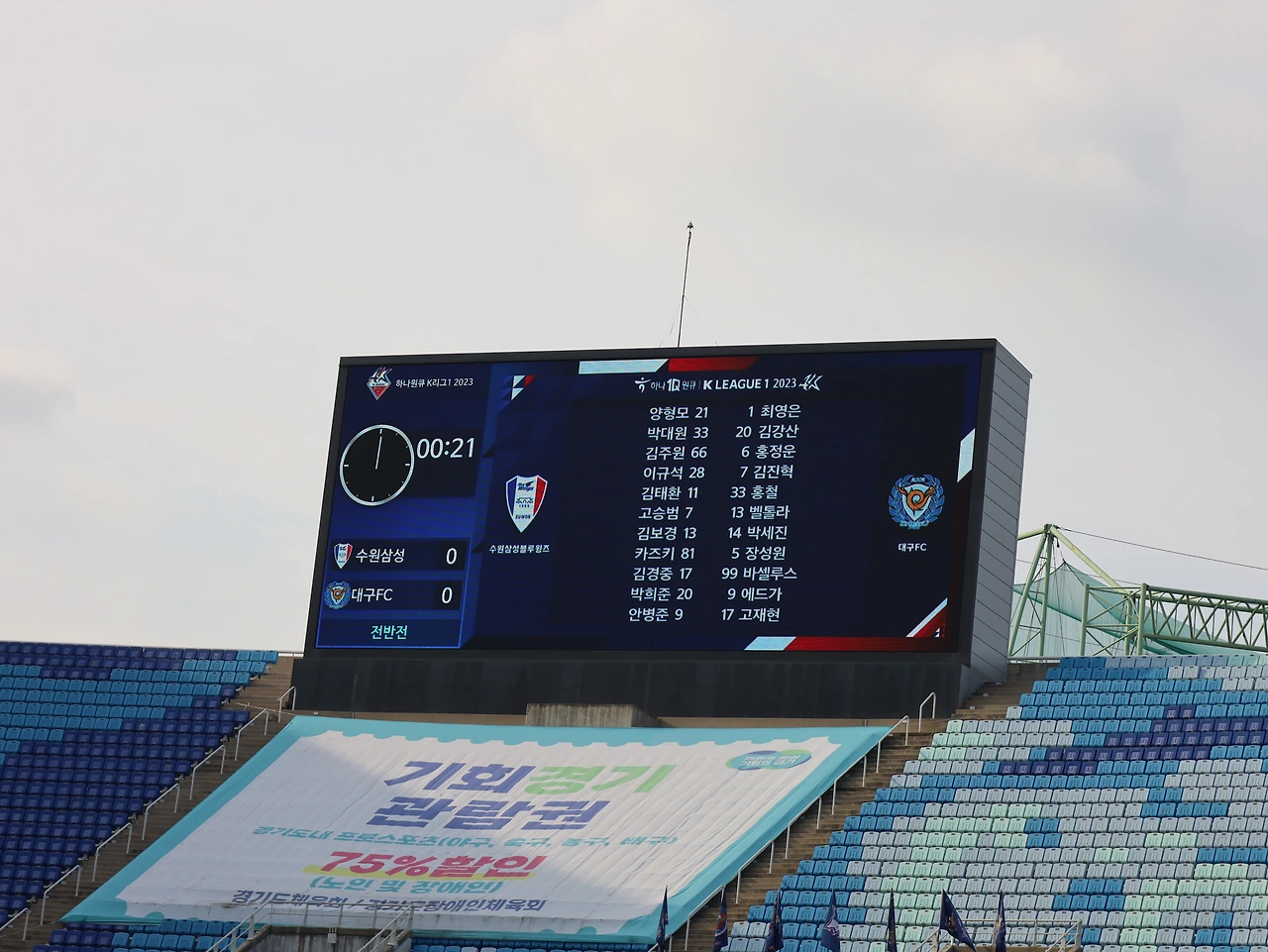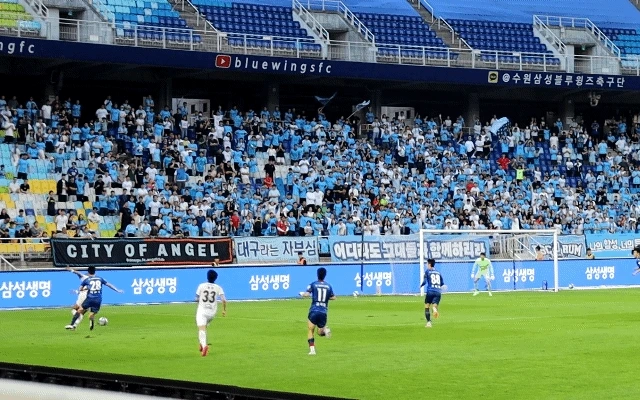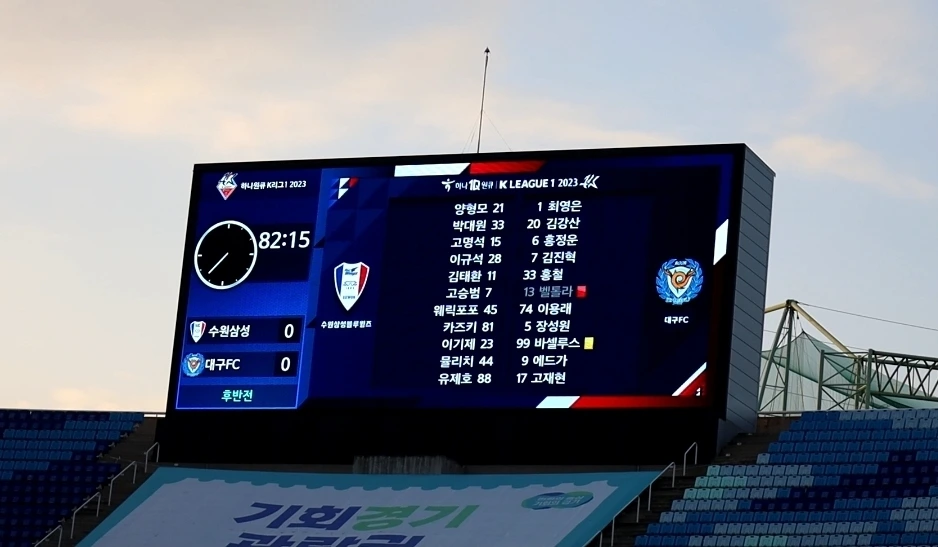 득점 없이 전반전이 끝나고 후반전이 시작됐다. 이기제, 포포, 뮬황이 투입되었다. 후반 11분 대구의 벨톨라가 퇴장을 당했다. 현장에 있으니 어떤 이유 때문인지는 알 수 없었지만 어쨌든 수원에게는 유리한 상황이 되었다. 팬들은 환호하는 와중에도 이런 상황에서 이기지 못했던 경기들을 상기한다. 꼴찌팀 수원에게 완벽하게 유리한 상황이란 존재하지 않는다는 불안감이 저변에 깔려있다. 그렇게 그렇게 시간이 간다. 별다른 기회를 만들지도 못한다. 오히려 막판으로 갈수록 대구의 날카로운 공격에 가슴을 쓸어내린다. 이거 뭔가 좀 안 좋게 흘러갈 것 같다.