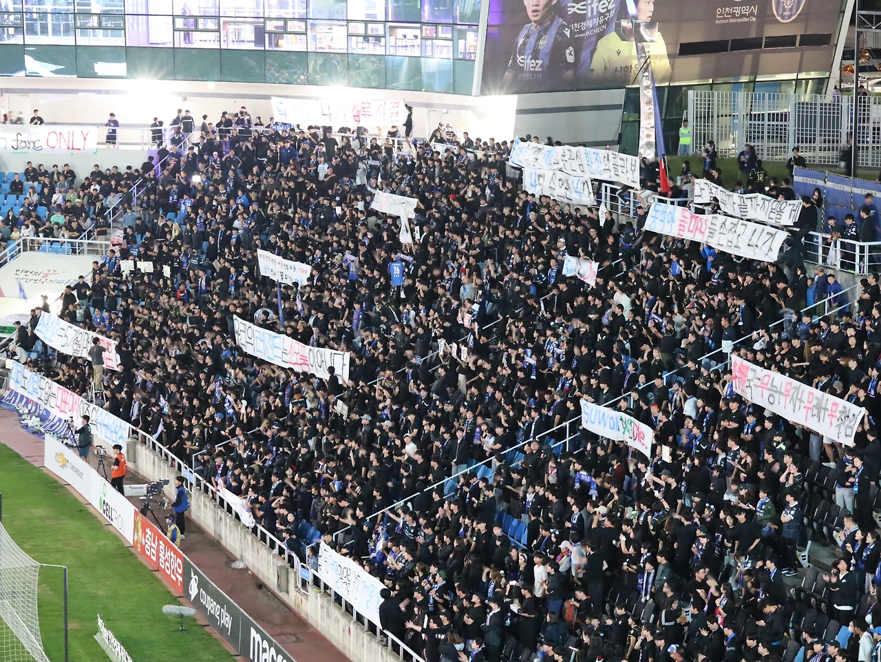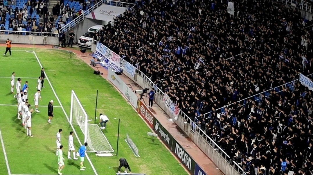 염기훈 감독대행의 첫 경기이다. 하지만 정상적인 수순의 대행자가 아닌 상황이라 그 또한 피해자라는 인식이 강하다. 김병수 감독을 그렇게 내보내는 건 시기와 과정을 고려했을 때 적절하지 못한 결정이었다. 그런 결정에 시위하기 위해 원정석의 드레스코드는 상복 색상이었고 결정자들을 비난하는 걸개가 도처에 걸렸다. 안타까운 광경이다. 팬들의 권리이자 의무는 응원인데 누군가를 비난하는 일에도 시간을 소비해야 한다는 게 소모적이고 불합리한 현실 속에 처해있음을 말해준다.