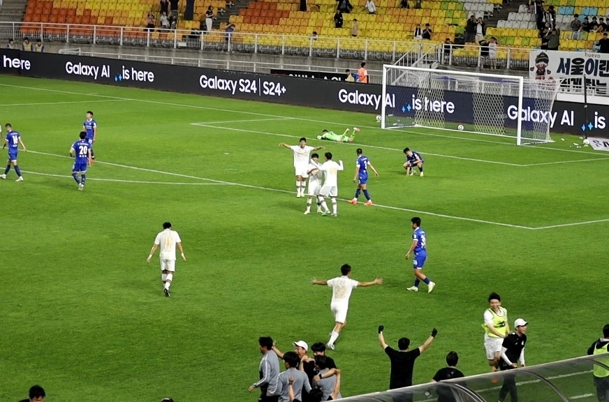 그러나 바로 그 결정적인 찬스에서 두 번이나 골대를 맞히는 일이 벌어지면서 나는 다시 불안해지기 시작했다. 이런 분위기에 골을 넣지 못하면 경기가 쉽게 뒤집힐 수 있다는 걸 알기 때문이다. 그런 불안은 바로 현실로 이어졌다. 골대를 맞혔던 수원의 불운과는 다르게 서울이랜드는 크로스로 올린 볼이 골대 구석으로 들어가 버렸다.