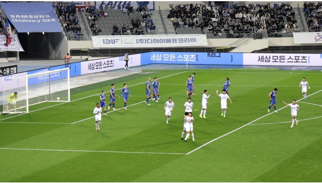 후반전에는 박승수와 김현이 투입되었다. 공격이 조금씩 날카로워지기 시작했다. 박승수는 측면에서 수비수를 흔드는 역할을 잘해줬고 김현은 패널티박스 안에서 버텨주는 역할을 충실히 해냈다. 결국은 박승수가 만든 코너킥 찬스에서 김현의 어시스트를 받은 이기제의 환상적인 왼발 중거리슛이 동점골을 만들어냈다. 이기제는 N석으로 달려가지 않았다. 동점이 목표가 아니고 역전이 목표였기 때문에 시간을 지체할 수 없었다. 찬 바람이 부는 날씨였지만 경기장은 열기로 뜨거워지기 시작했다.
