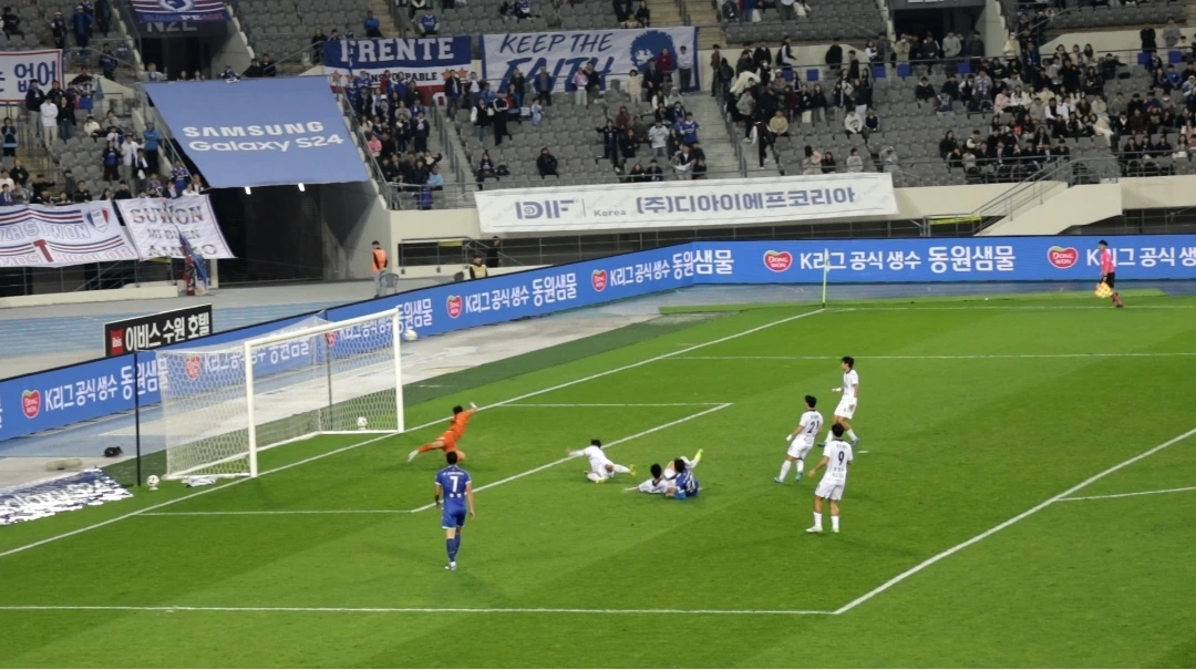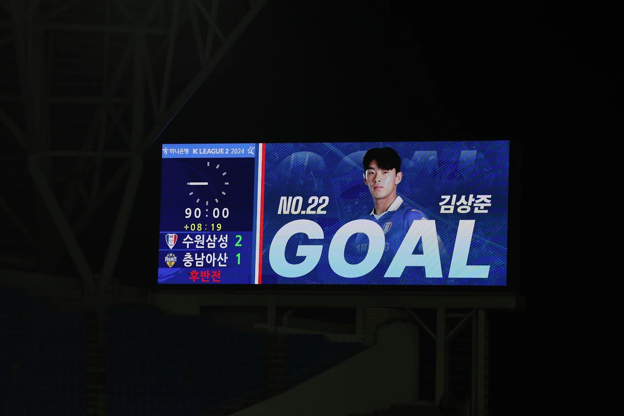 몇 번의 찬스에서 답답한 플레이를 보였던 이종성이 중앙선 부근에서 크로스를 날린다. 긴 포물선을 그리며 허공에 궤적을 남긴다. 패널티박스를 넘은 공은 김상준의 가슴과 마주친다. 갓난아이가 엄마 품에 안기듯 그 가슴에 안전하게 안착된다. 공이 그라운드에 닿자마자 이번에는 김상준의 발이 나서서 탄력을 죽인다. 넘어지는 자세로, 그러나 정확한 타이밍으로 슈팅을 때린다. 오른쪽 위쪽 골망을 흔든다. 김상준은 거침없이 N석으로 달려간다. 극적인 극장골이 수원팬들을 포효하게 만든다. 잠시 죽어있던 5위를 향한 희망도 극적으로 부활한다.
