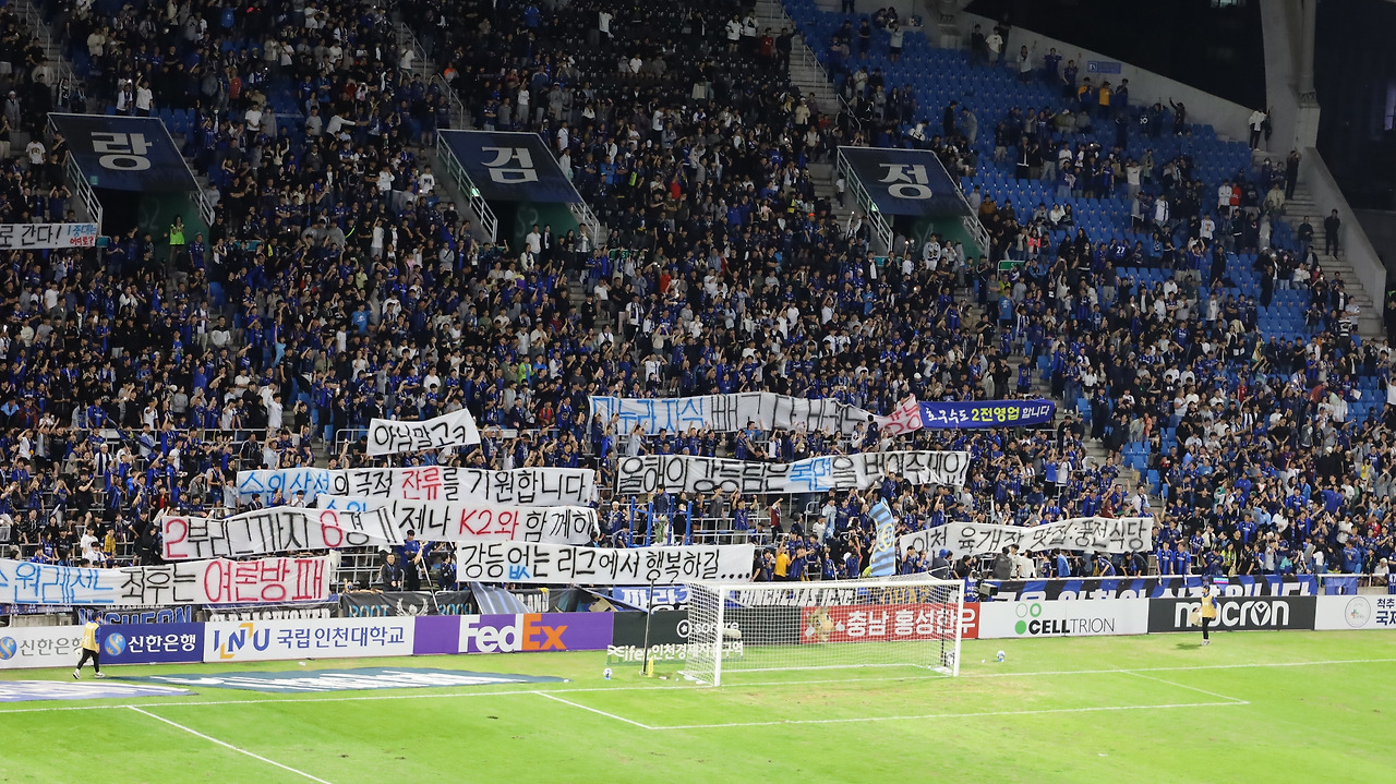작년 가을, 인천 원정 경기에서 수원이 패한 후 경기장의 모든 구역에서 '수원강등'을 외치던 공포스러운 기억이 떠오른다. 수원을 조롱하는 걸개와 원정석을 향한 모욕 행위들을 목도하면서 심히 불쾌했지만 도대체 수원한테 얼마나 당한 게 많으면 저러는 것일까 궁금하기도 했다. 복수는 복수를 낳는 것일까. 수원이 당했던 똑같은 방식으로 인천은 대전에게 조롱을 당해야 했다.