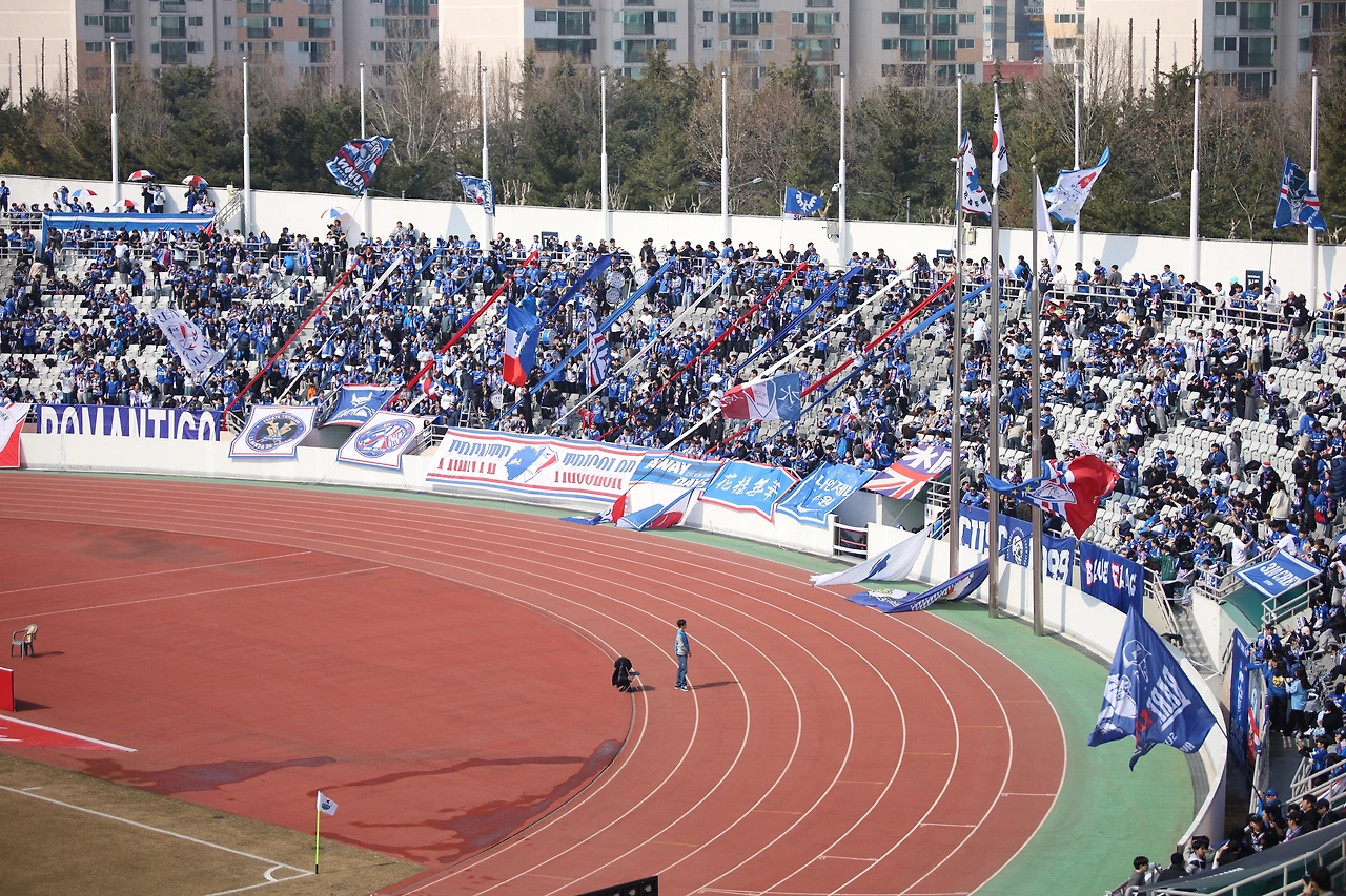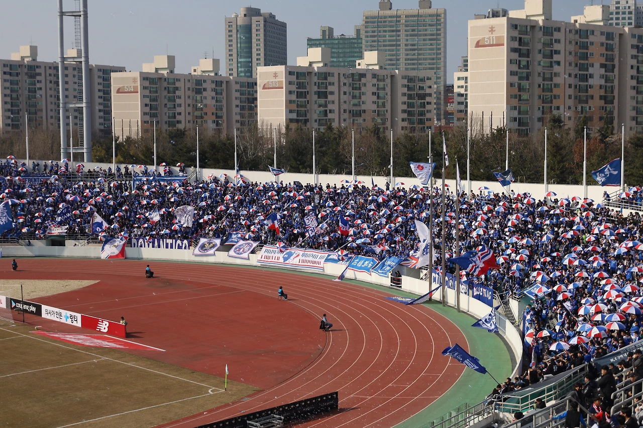 스토리가 없는 상대였어도 그랬겠지만 티켓을 오픈한 지 몇 분 되지 않아 원정석은 매진됐다. 타이밍을 놓쳤던 나도 평상복 차림으로 E석에 앉아 조용히 관람해야 했다. 조금 멀리서 바라보는 원정석의 풍경은 장관이었다. 응원가를 따라 부르거나 액션을 함께 할 수는 없었으나 저들의 열기가 어떨지는 충분히 상상이 가능했다. 적당한 바람과 더운 느낌의 공기가 축구를 보기에도 축구를 하기에도 좋은 날씨였다.