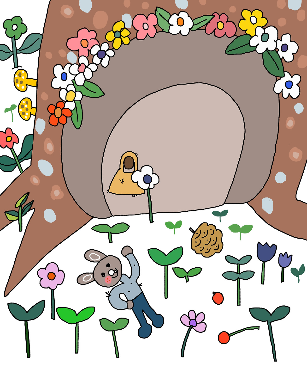 꽃과 풀이 계절에 맞게 자라고 있는지 두루두루 살펴봐. 조조의 작은 집은 나무 밑동에 있어.