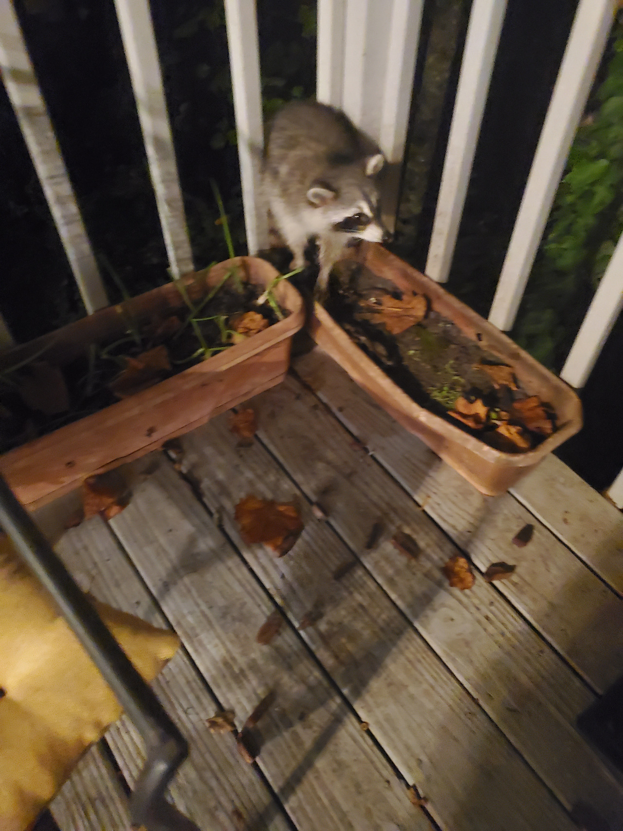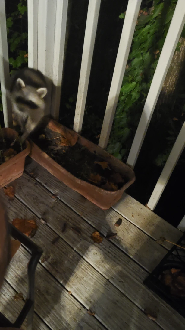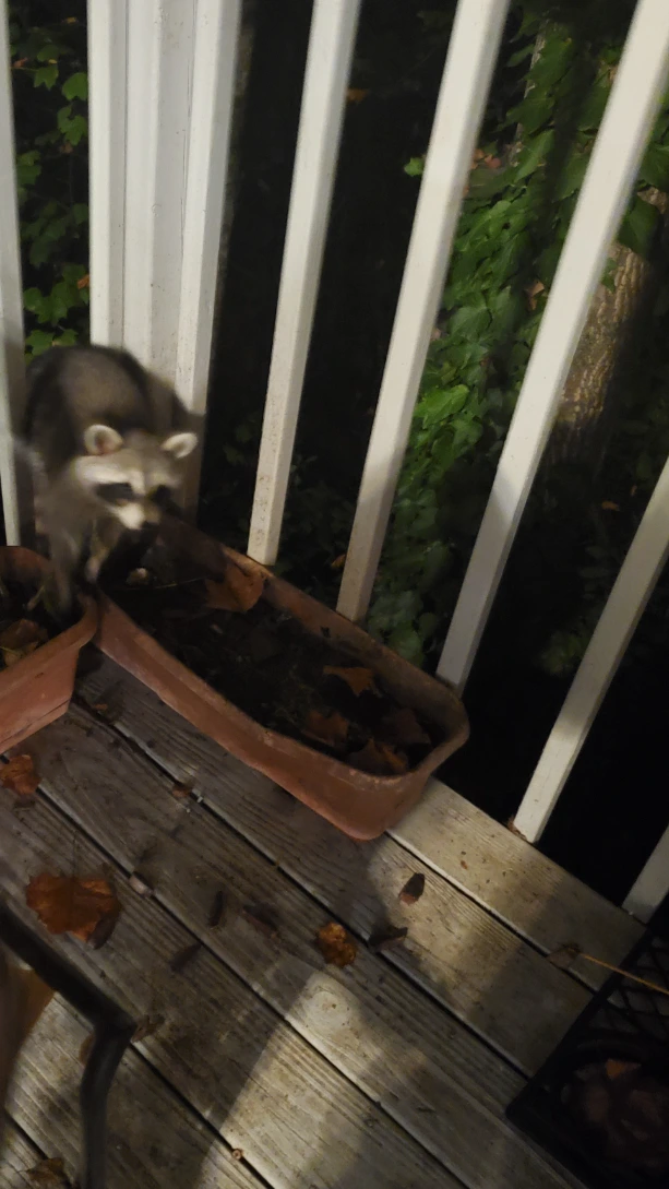밤이 되면 이 지역의 또 다른 구성원인 너구리가 나무를 타고 올라와 뒷마당 데크를 넘어온다.