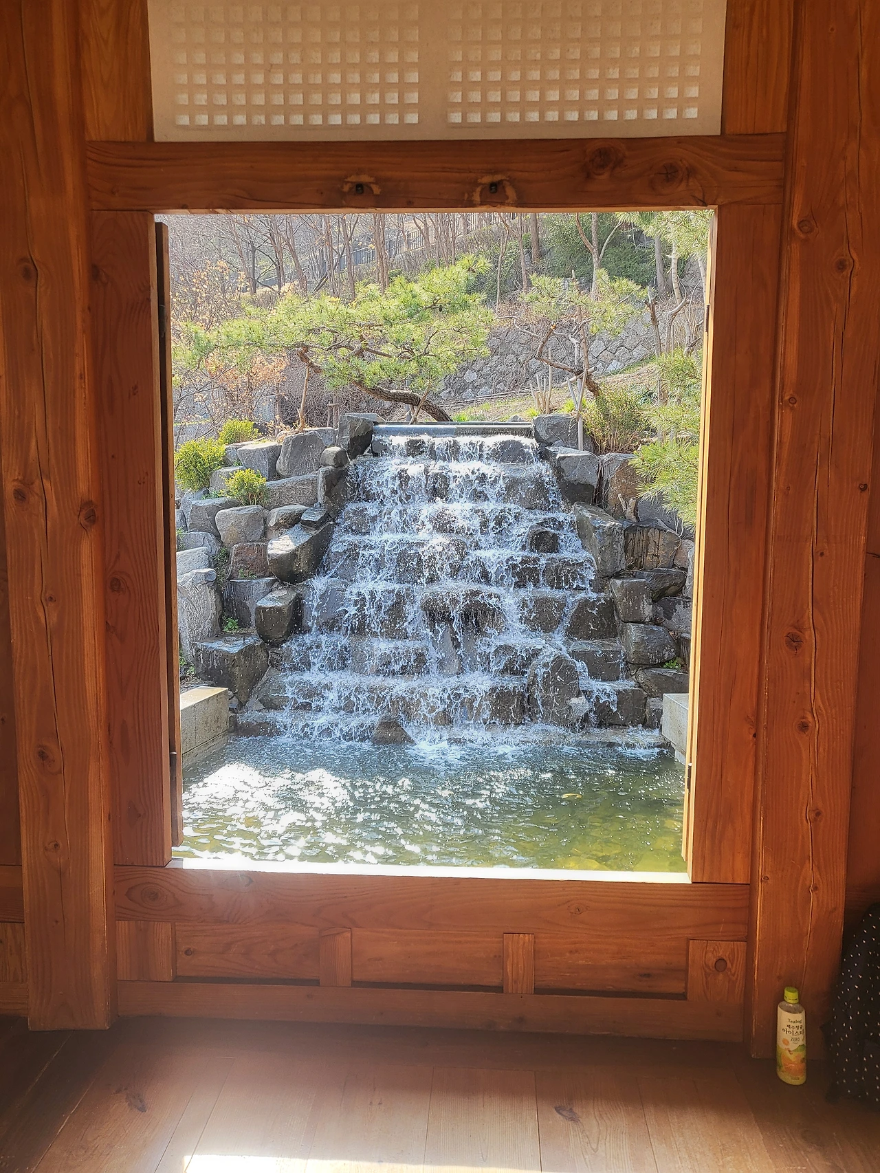 한옥 안 바닥에 걸터앉아 쏟아져 내리는 작은 폭포의 물줄기를 바라보고 있노라면 무상무념이 된다.