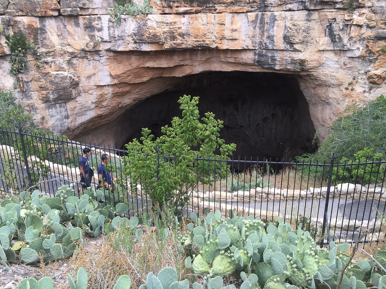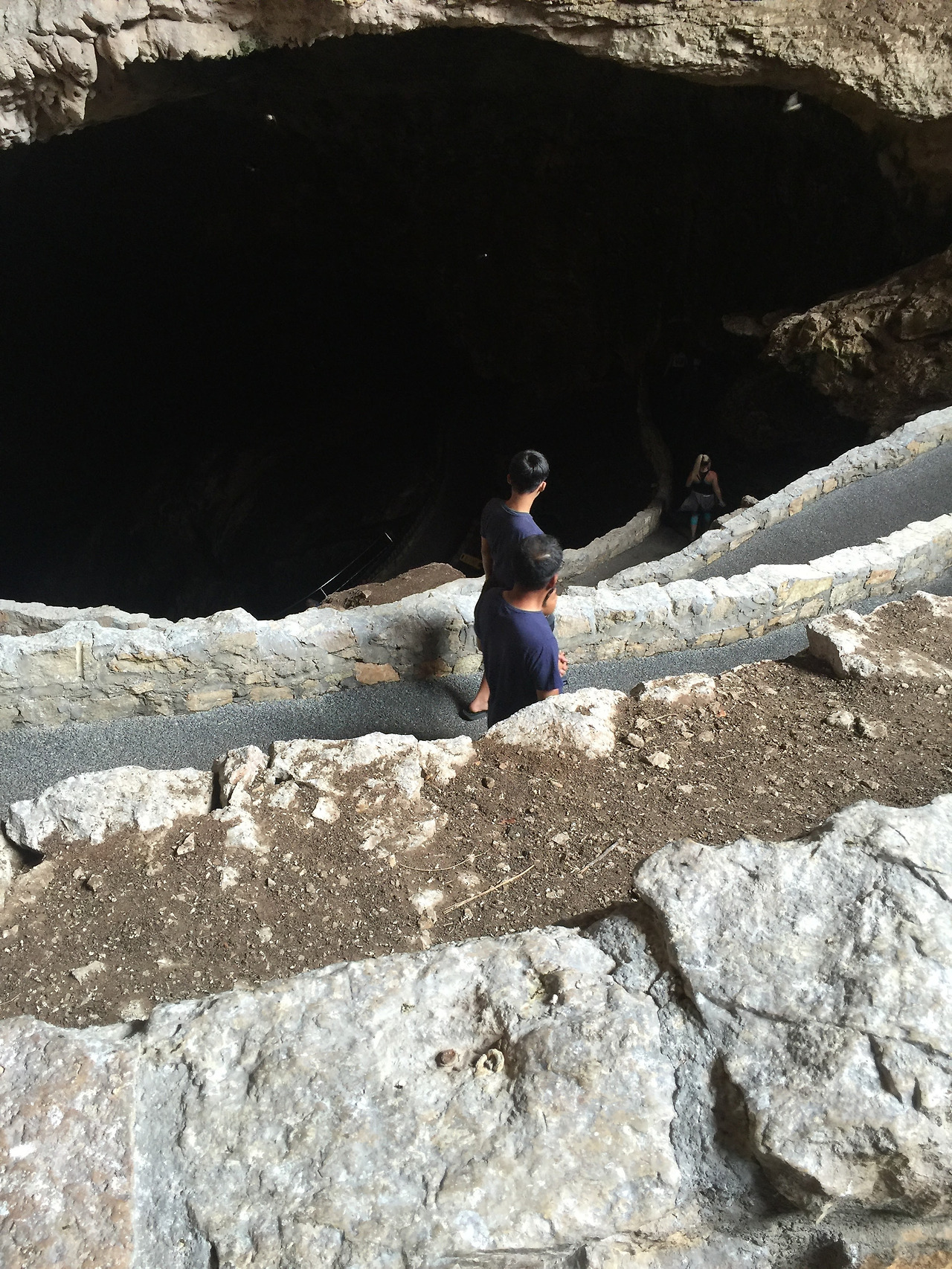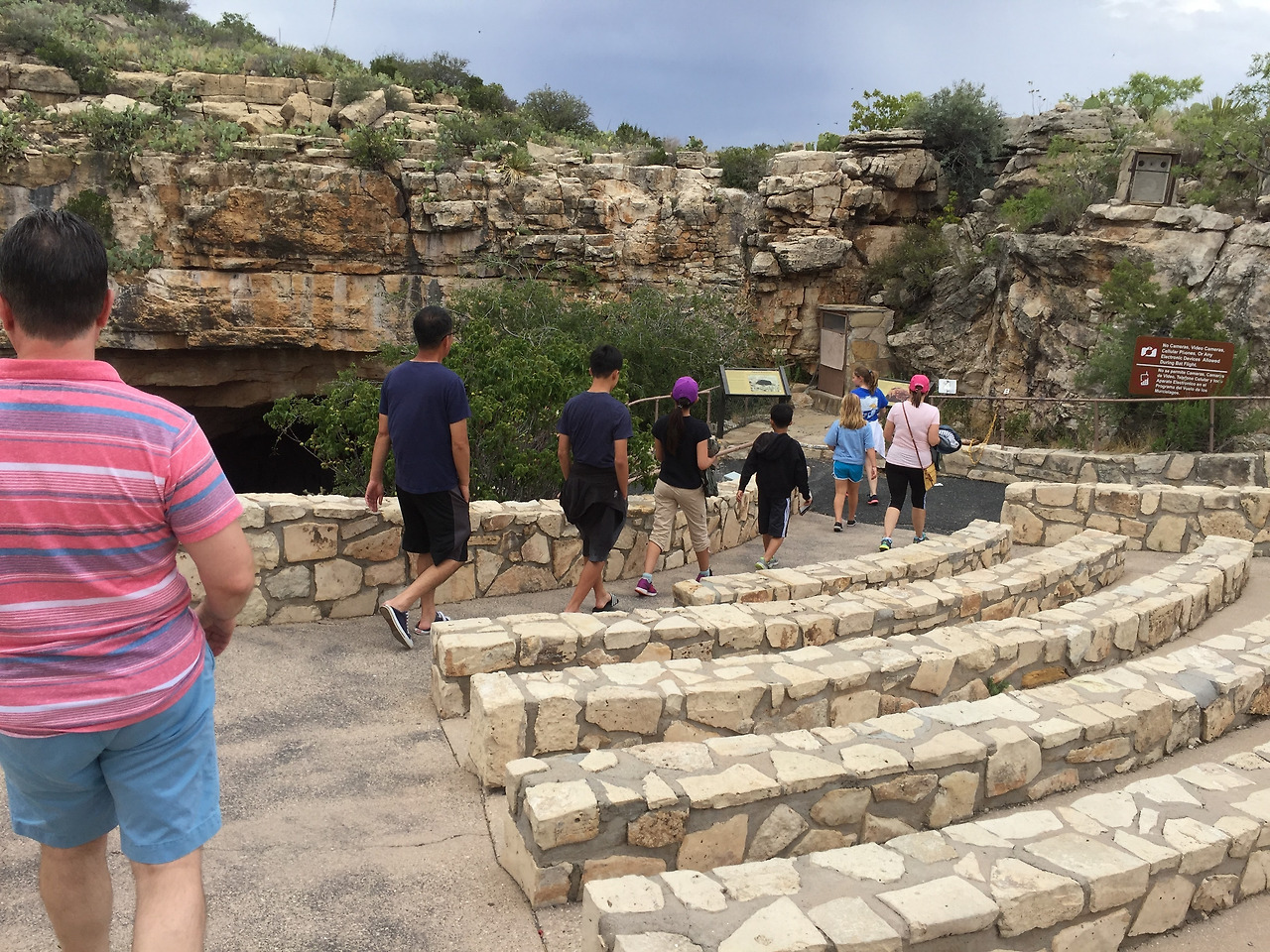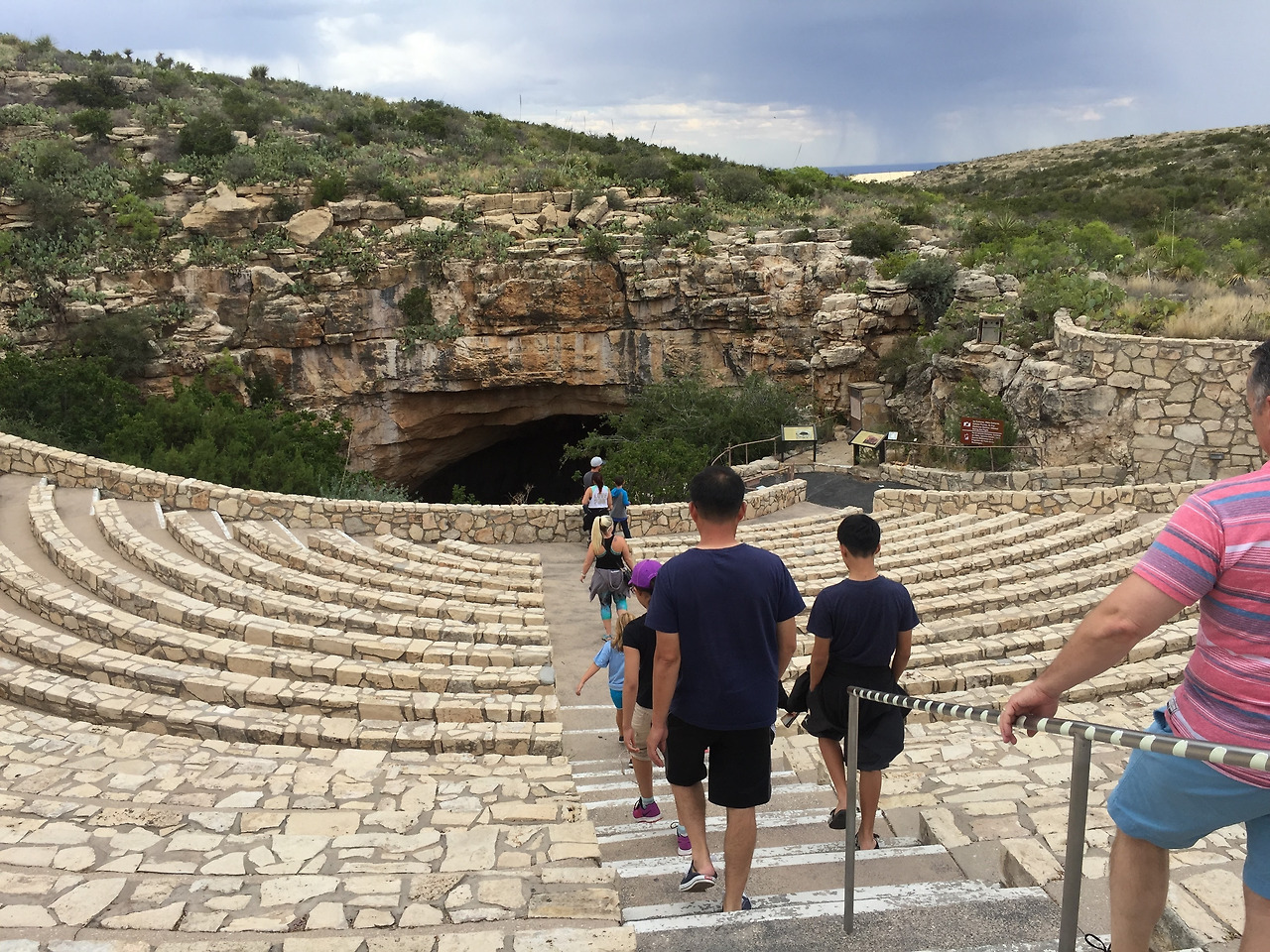 다른 국립공원의 어느 곳이나 마찬가지로 가장 처음 들리는 비지터 센터는 깔끔하게 박물관 형식으로 현대적인 모습을 갖추고 있었고 전시관 형태로 이루어진 여기저기 걸려있는 사진들은 이 동굴의 역사를 설명해 주고 있었다. 동굴로 들어가는 길은 두 가지 방법이 있었는데 지하 750 미터까지 뚫려있는 엘리베이터를 타고 바로 내려가는 방법과 natural entrance 즉, 걸어서 직접 입구를 통해 내려가는 방법 두 가지가 있었다. 우리는 편한 길을 찾기보다는 가슴속에 하나라도 더 담아 가기 위해 걸어가는 쪽으로 택했다. 센터 뒤 쪽으로 난 문을 통해 사람들 뒤를 따라 걷기 시작했다. 문을 열고 나가자마자 옛날 고대 극장에서나 볼 수 있는 광경인 돌로 만들어진 원형극장이 입구를 향하여 자리하고 있었다. 이 곳에서는 낮에는 자신의 종적을 감췄다가 밤이 돼서야 먹잇감을 찾으러 동굴을 나서는 박쥐들의 비행을 볼 수 있는 곳이라 하는데 밤까지 기다릴 수가 없어 그 광경은 볼 수가 없었다.