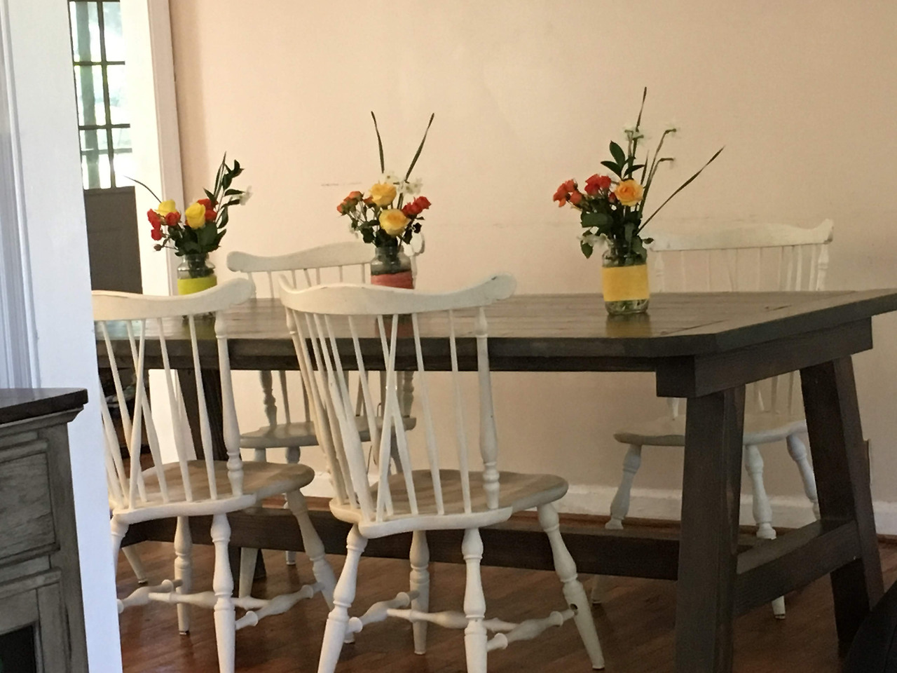 이 의자들을 가지고 와서 남편이 만들고 있는 회색의 나무 테이블과 조화를 이루는 흰색의 매트한 페인트로 의자를 리폼했다. 거기에 빈티지한 느낌을 주기 위해 크랙을 내는 왁싱을 덧입히니 제법 그럴싸 한 작품이 나왔다.