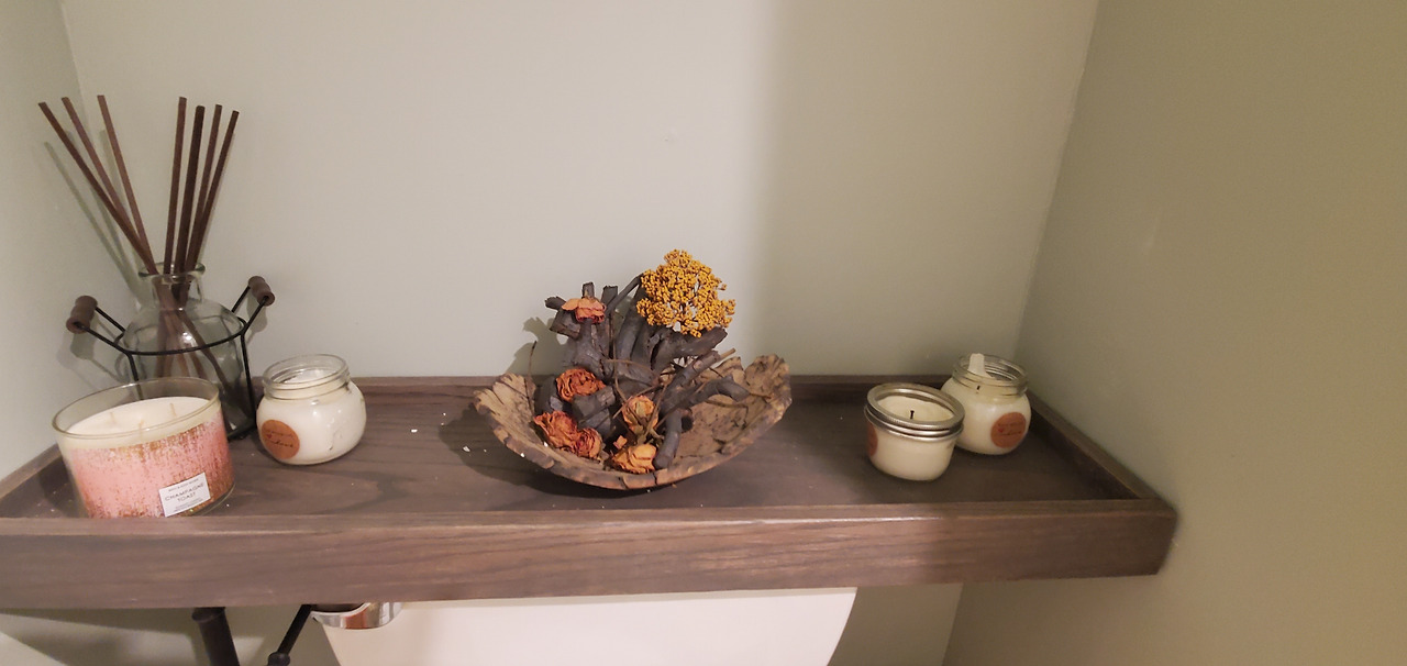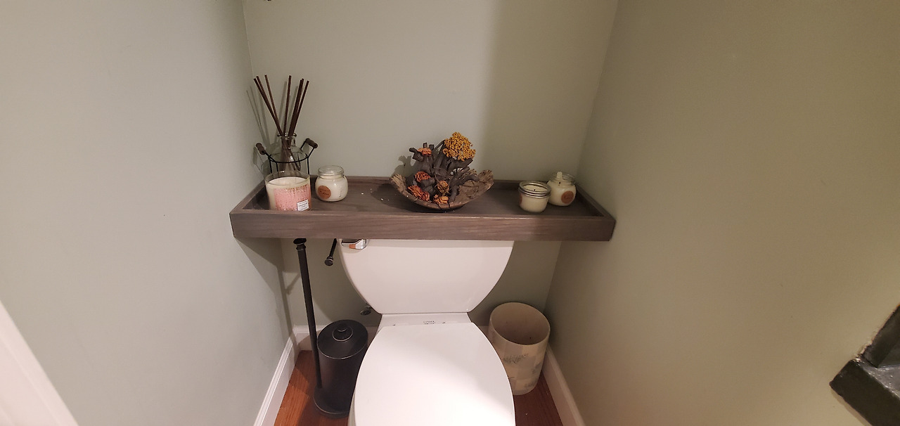 수건걸이와 휴지걸이도 직접 남편이 색을 입혀 원목으로 만들고, 변기용 뚜껑도 원래 없었는데 그냥 수건걸이와 세트로 원목나무로 맞추었다. 친한 동생이 놀러 와서 이 인테리어를 탐을 냈다.