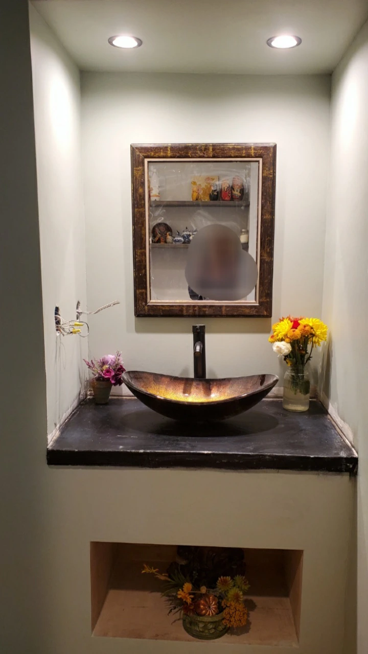 세면대와 거울의 테두리 또한 그림 액자와 우연히 매치가 되어 그림을 뜯어내고 거울용 액자로 사용하였다. 묘하게 매치가 잘 된다. 세면대 위에 꼬마 리세스 등을 달고 나니 근사한 화장실이 만들어졌다. 꽤 근사한 공간이 탄생했다.