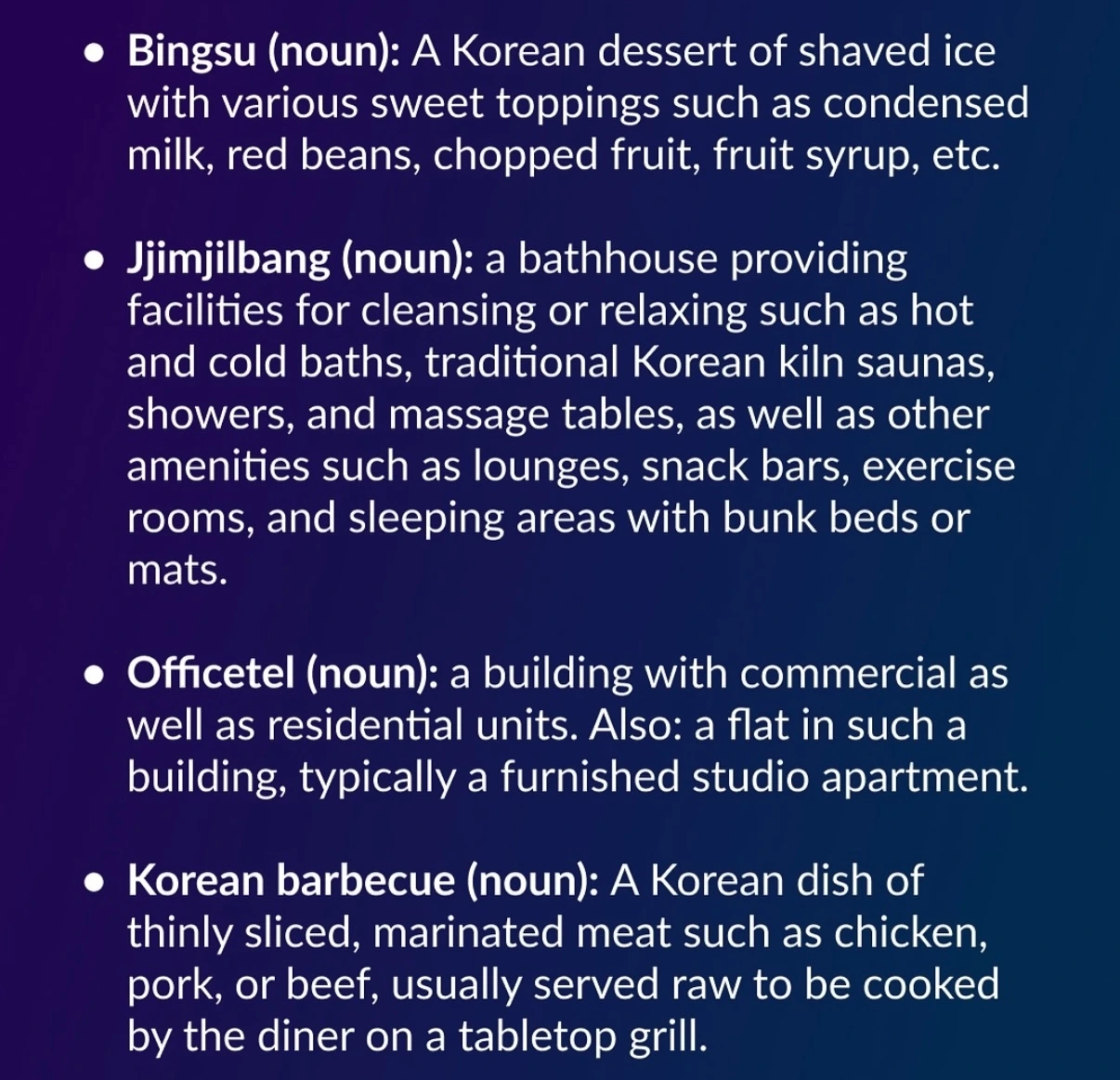 빙수, 찜질방, 오피스텔, 코리안 바비큐
