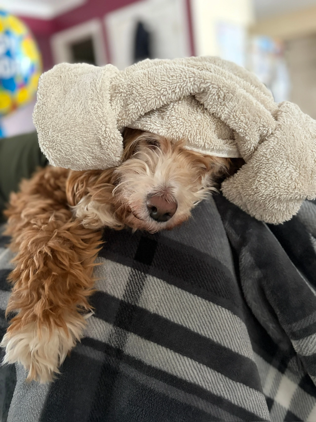 찜질방 타월 양머리 룩을 완벽하게 소화한 우리 빼꼼이, 작은 평화 속에 누워 있다.