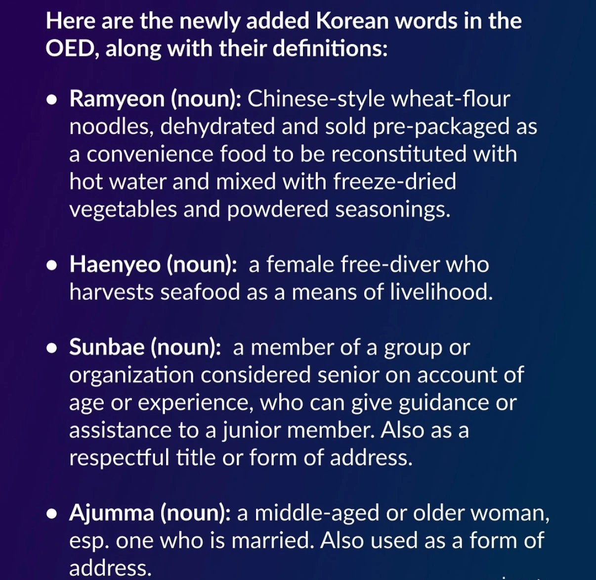 1월 2026년, 올해 옥스퍼드 영어사전 (Oxford Dictionary)에 한국 단어 여덟 개가 새로 등록됐다.