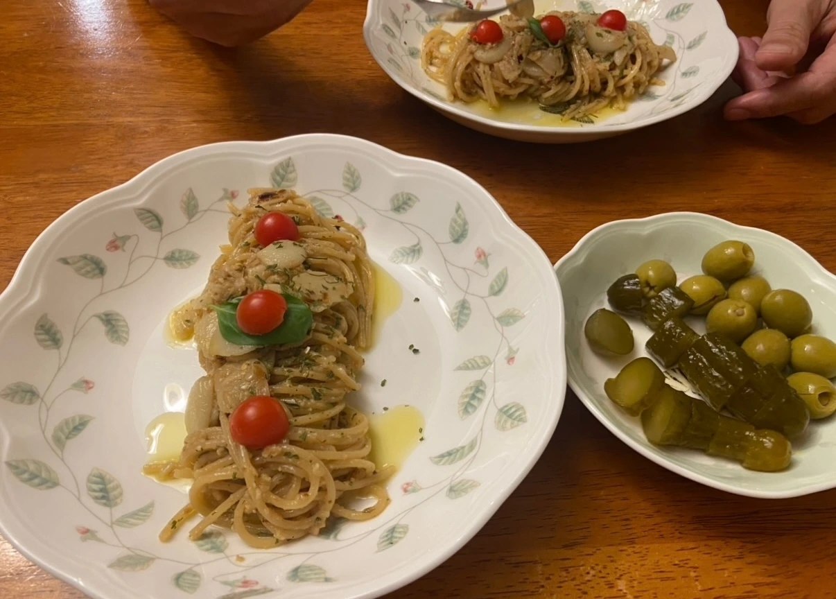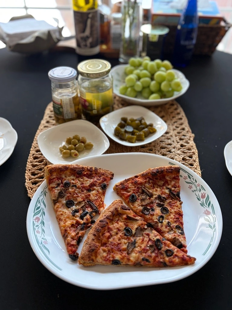 피자를 한 입 베어 물고, 피클을 집어 들며 와인을 마셨다. 이 조합이 자연스럽게 느껴지는 순간, 내가 여전히 한국식 식탁 옆에 서 있다는 걸 알았다. 외국 음식이라도, 결국은 우리 방식으로 먹게 된다. 피자와 파스타 옆에 놓인 작은 피클 접시는 식사의 리듬을 만들어준다.