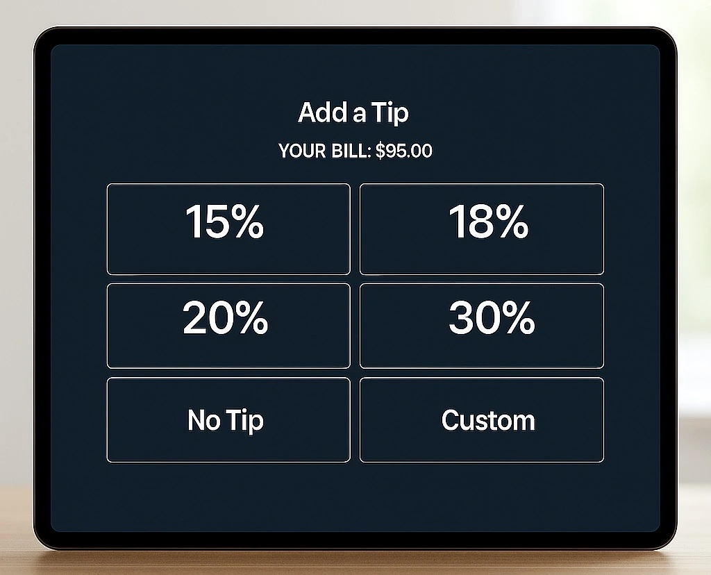 'Tip: 18% / 20% / 25%/No Tip/Custom'